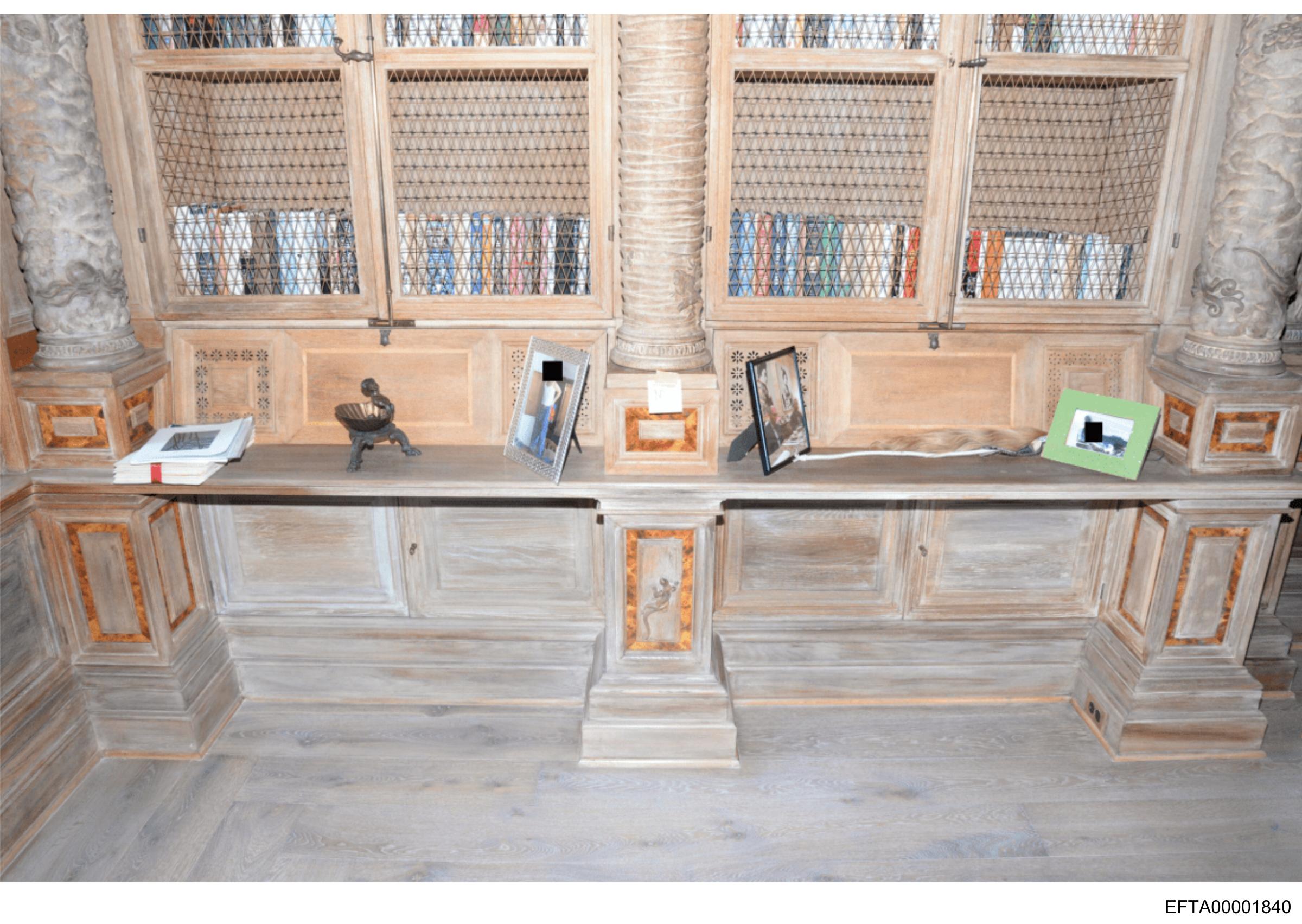 The image depicts a room with a large wooden bookshelf filled with books.