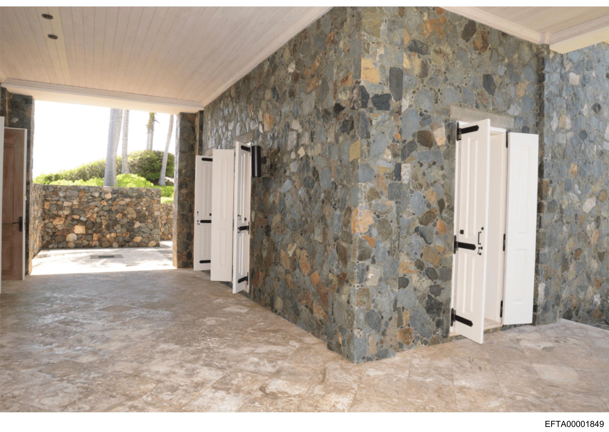 The image shows the exterior of a building with a stone facade featuring various shades of brown and gray.