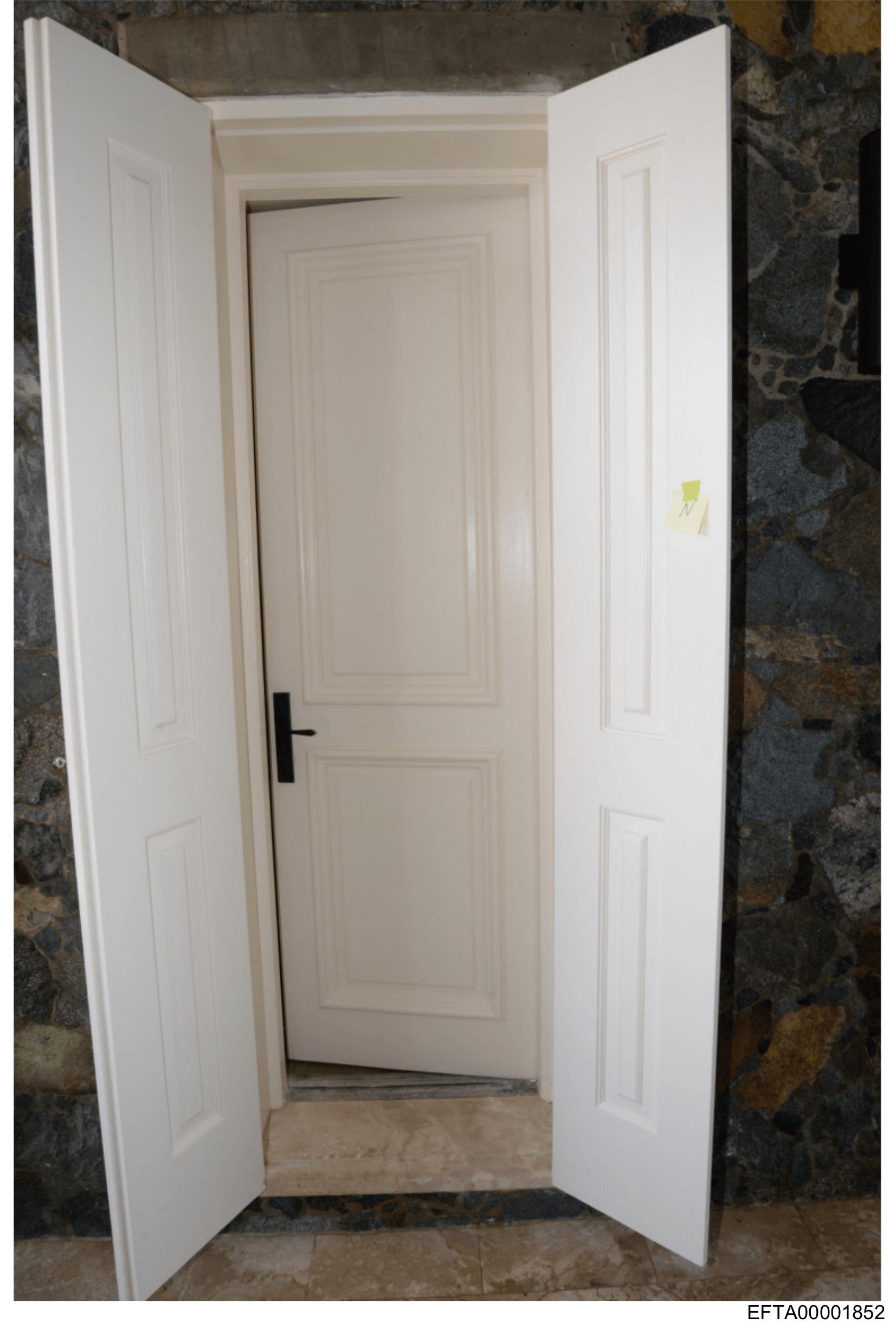 The image shows a door that is partially open, revealing an interior hallway beyond.
