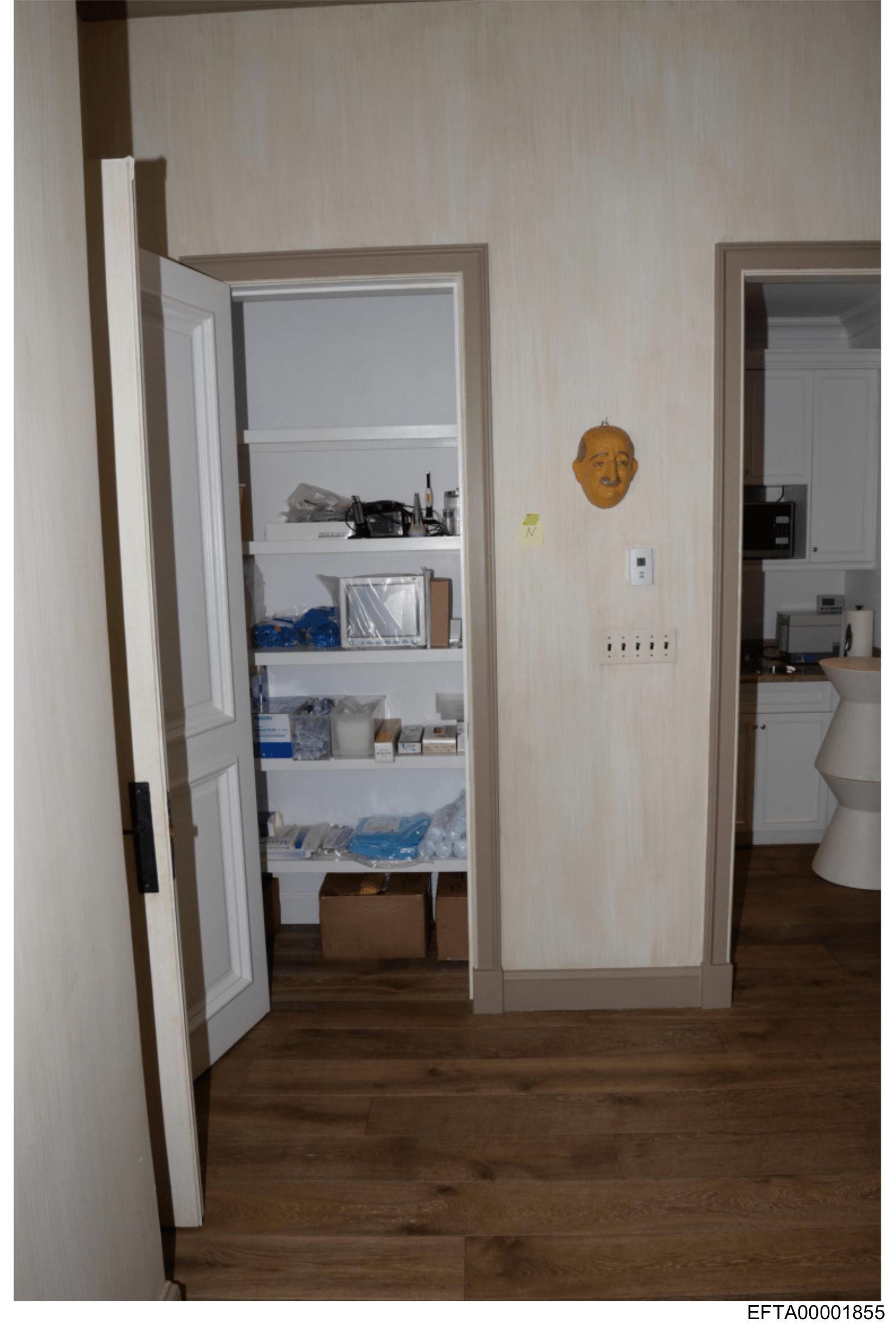 This is an image of a small room that appears to be undergoing some form of renovation or reorganization. On the left side of the photo, there's an open shelving unit which seems to hold various items, possibly tools and materials for the work being done. The flooring transitions from what looks like tiles to wooden planks, indicating different sections or rooms within the space. The walls are painted in a light beige color, with one wall featuring electrical outlets and another showing an incomplete appearance, possibly due to ongoing construction or repair work. There's no visible text on the image that provides additional information or context. The style of the photo is candid, perhaps taken quickly without staging or professional photography techniques.
