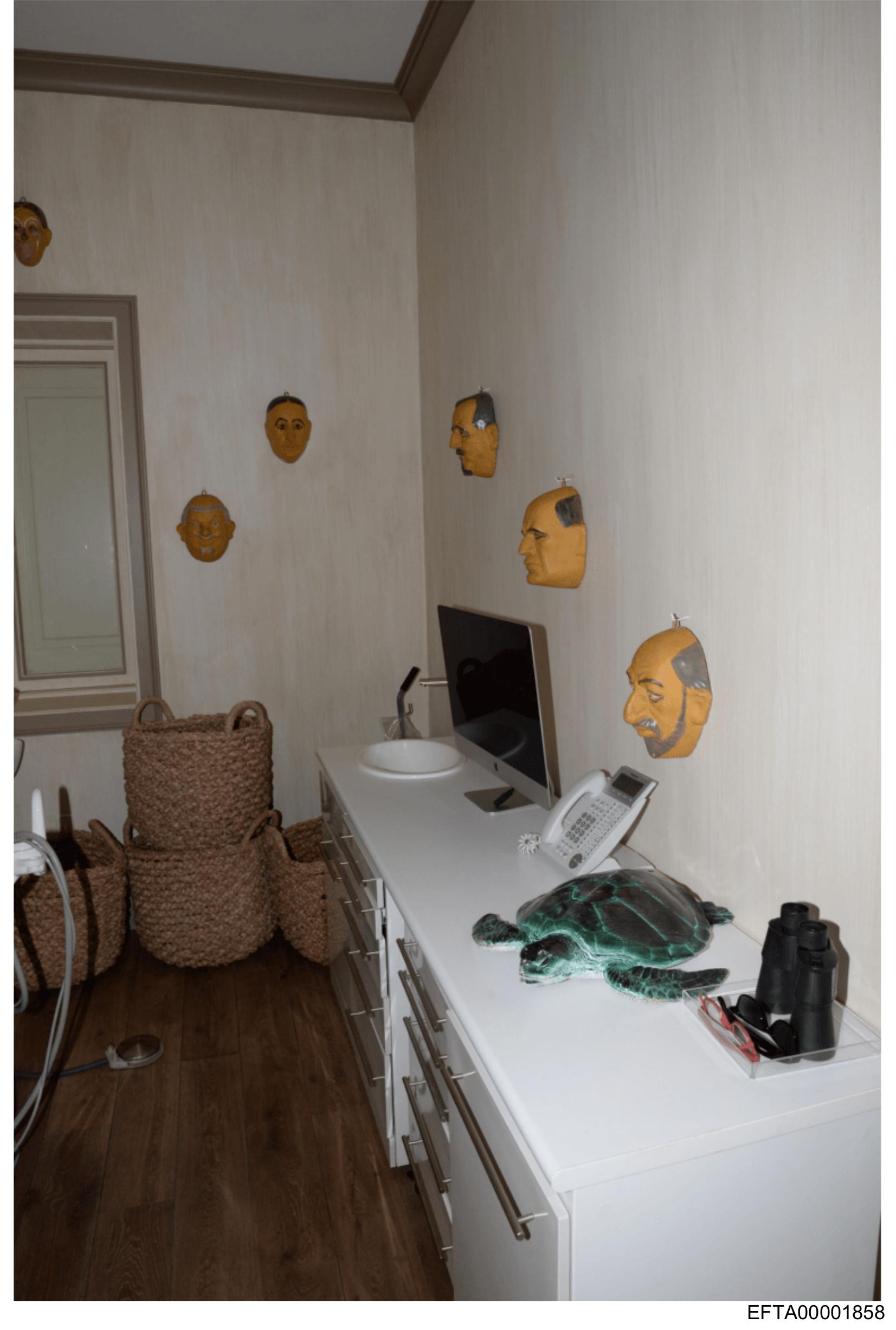The image shows a room with a desk that has various items on it, including what appears to be electronic equipment and a monitor. The wall behind the desk features several cutouts where pictures of men's faces have been placed, giving an eerie effect as if these characters are looking out from the walls. The door is partially open, revealing another room beyond. There is text at the bottom left corner of the image that seems to be a watermark or signature, but it's not entirely clear and doesn't provide any additional context about the content of the photo. The style of the image is realistic, capturing an indoor scene with personal touches that suggest it might be someone's living space.