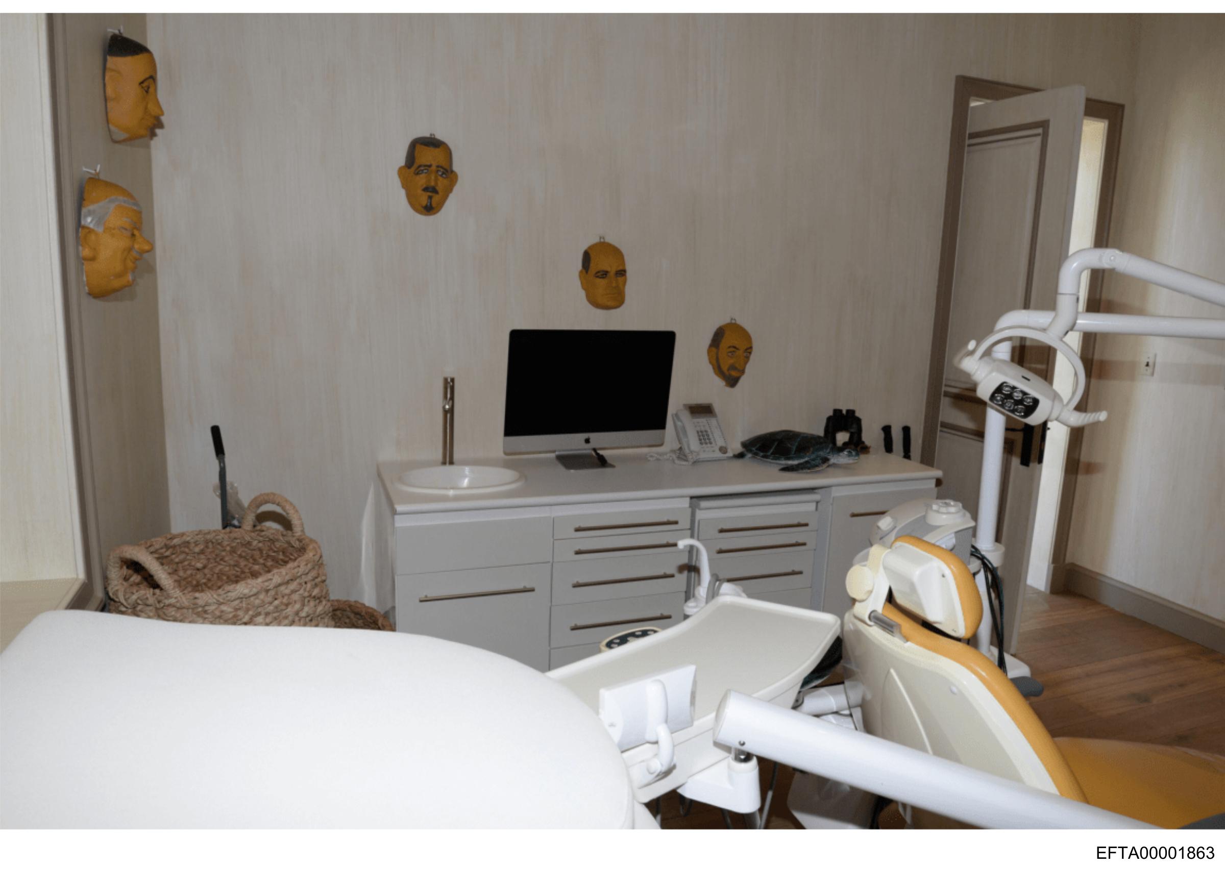 This is a photograph taken from the perspective of someone sitting in a dental chair. The room appears to be a dental office with typical dental equipment such as a light fixture that focuses on the patient's mouth and adjustable armrests for the dentist or hygienist. There are framed pictures hanging above a countertop, but their contents are not clearly visible due to a watermark overlaying the image. The text "ETC/37" is present in the lower right corner of the photo, which could be part of a series number or page identifier for an album or project. There are no people visible in the image.