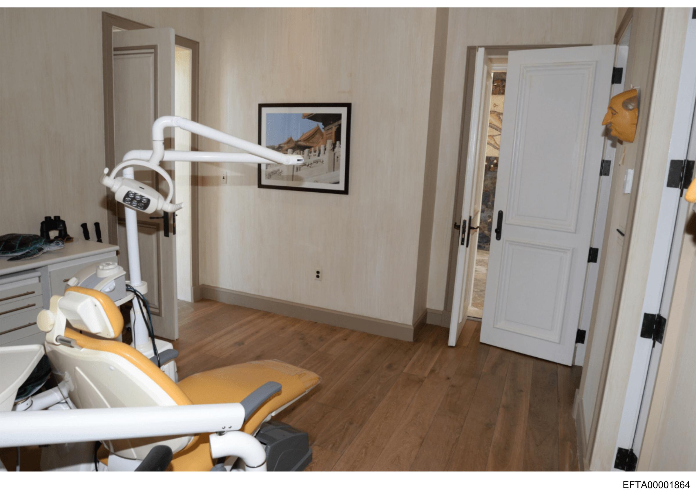 The image shows an interior view of a dental office. In the foreground, there's a dental chair with equipment attached to it, likely for patient care and examination. The walls are painted light colors, and on one wall hangs a framed picture, though its content is not clear from this angle. There's a closed white door visible in the background, providing an exit or entrance to the room. The floor appears to be wooden with a dark finish. There's no text visible in the image, and there are no people present.