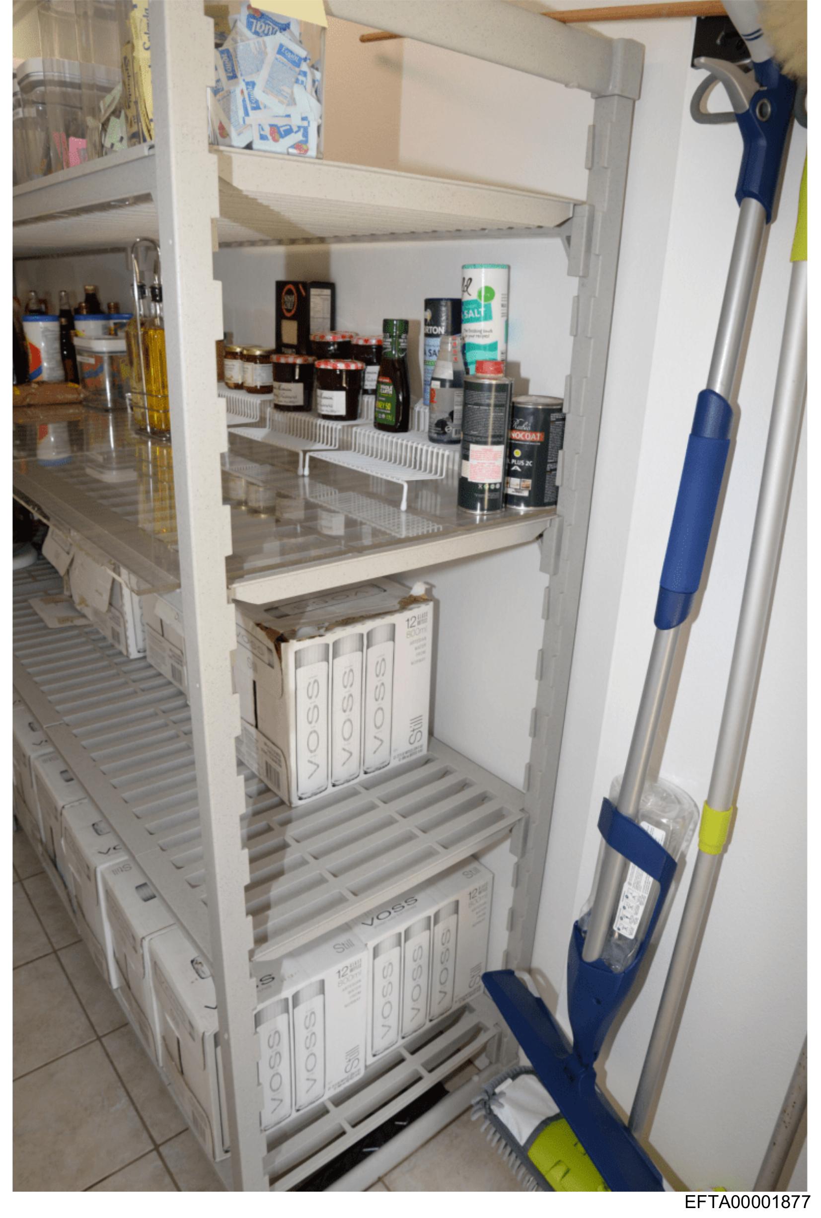 The image shows a metal shelving unit with various items on it. The shelves are stocked with numerous packaged products that appear to be food and beverages, possibly in cans and bottles, given the shapes and sizes. In addition to the consumer goods, there is a ladder propped against the shelf unit, which suggests maintenance or stocking activities are either underway or recently completed. The setting looks like an interior space, potentially a storage area or warehouse, due to the industrial appearance of the shelving and the absence of any decorative elements in the background.