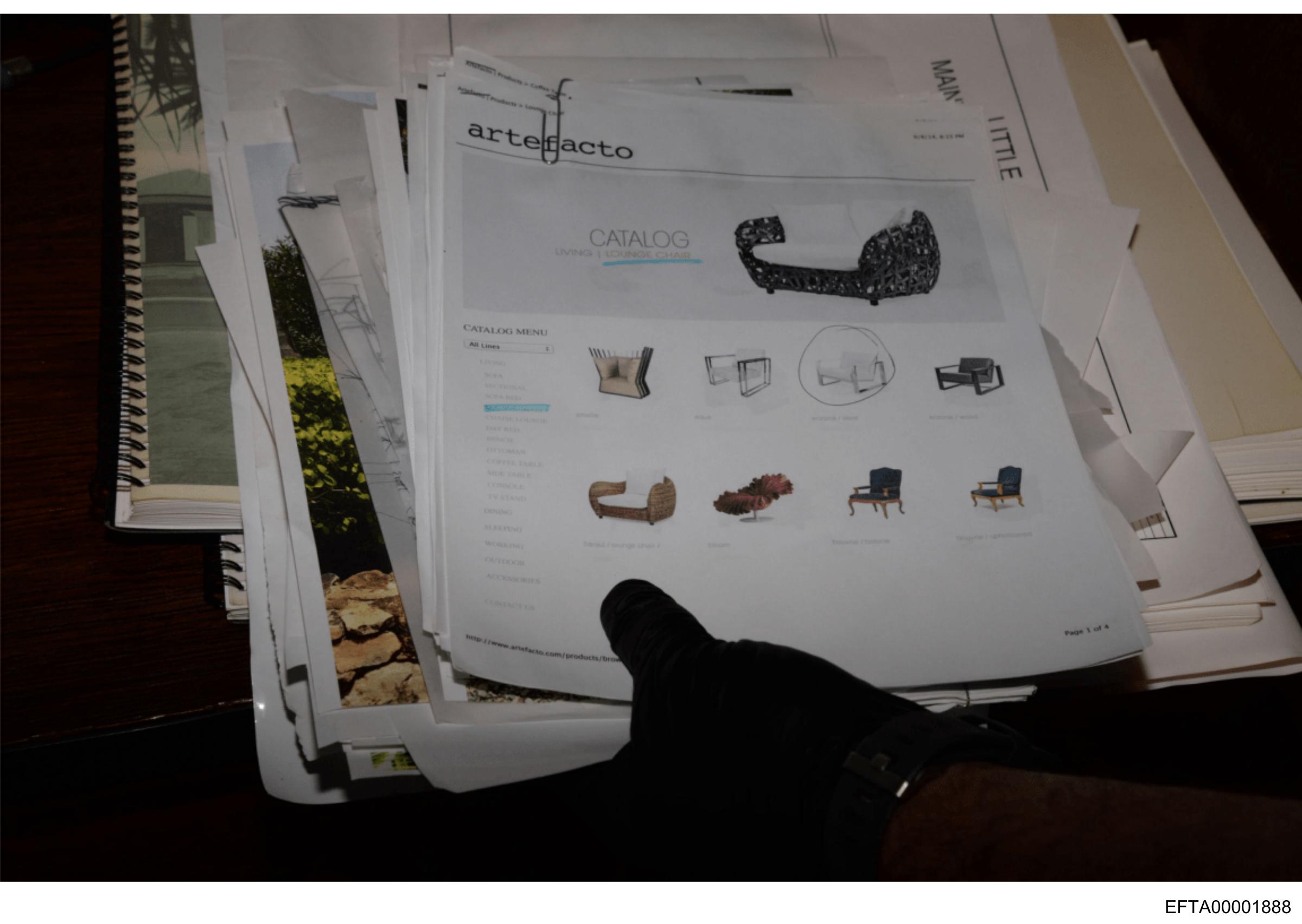 The image shows a collection of printed materials, possibly design mockups or catalogs, scattered and overlapping on what appears to be a wooden surface. The papers feature various images of chairs and other furniture pieces, suggesting they could be samples for a design project or a product selection. There is visible text on the materials that includes "Argo" and some smaller text that seems to be part of descriptions or names associated with the displayed items, but it's not entirely clear from this angle. A person's hand is seen in the foreground, partially holding up one of the papers, indicating someone might be reviewing the contents. The image has a watermark at the bottom right corner which reads "IMG_0613" followed by a copyright symbol and then "EXIF."