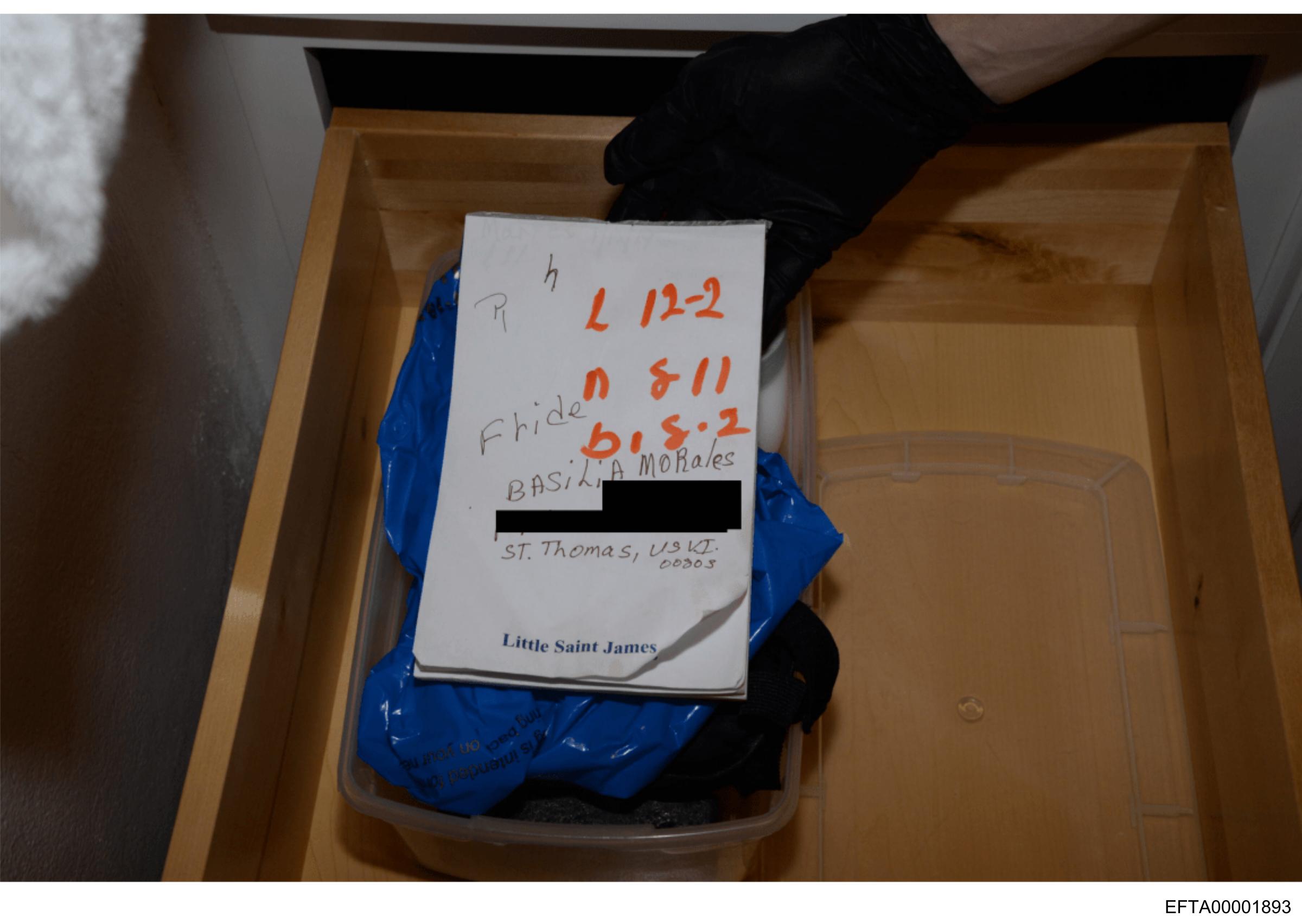 The image shows a close-up of an adult's hand wearing a black glove, holding what appears to be a piece of paper with writing on it. The writing is not in English and includes symbols that are not immediately recognizable as letters from any common language script. There is a blue plastic bag visible behind the paper, and there seems to be some sort of container or structure with a wooden texture on which the hand rests. In the lower right corner of the image, there is a watermark or logo with the text "EXCEL" in white capital letters against a dark background. The style of the image is candid, possibly taken during an investigation or handling process due to the glove and container's presence.