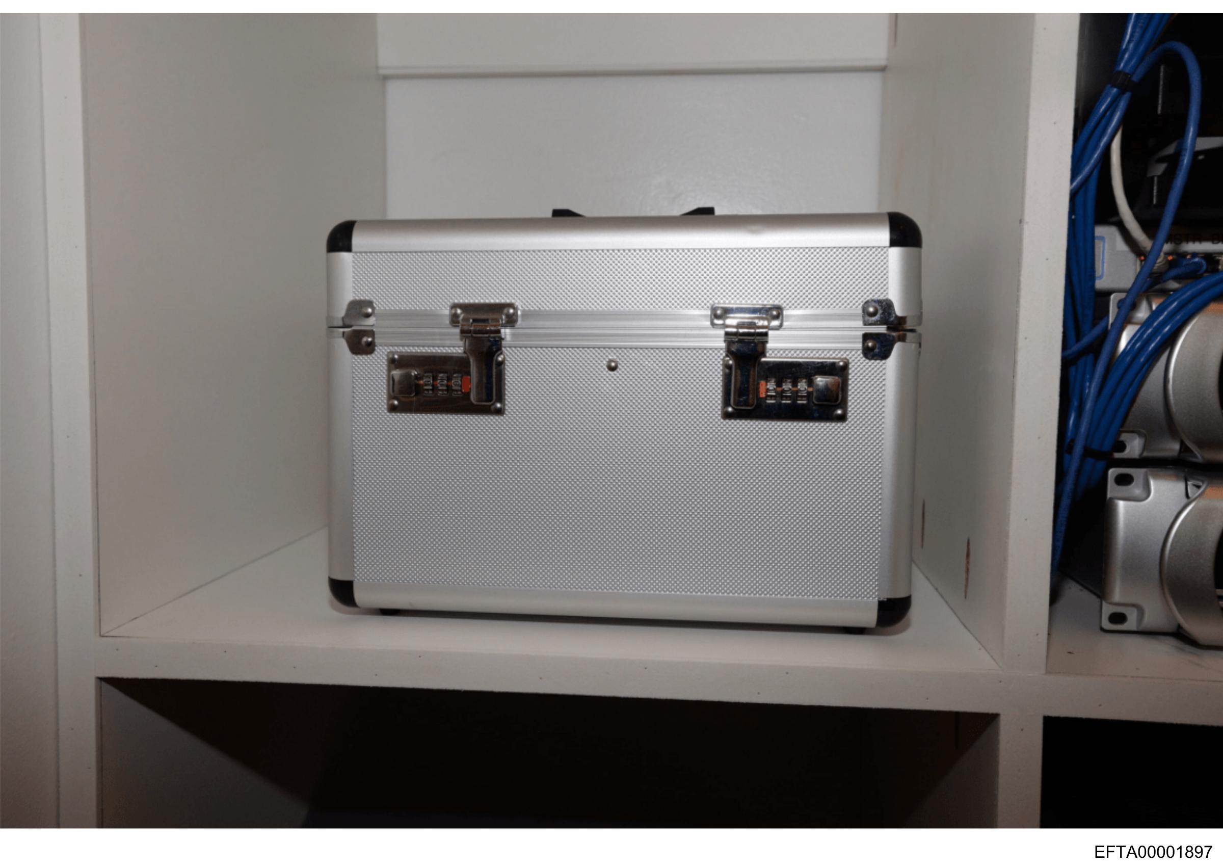 The image shows a metal briefcase placed on what appears to be a shelf or a counter.