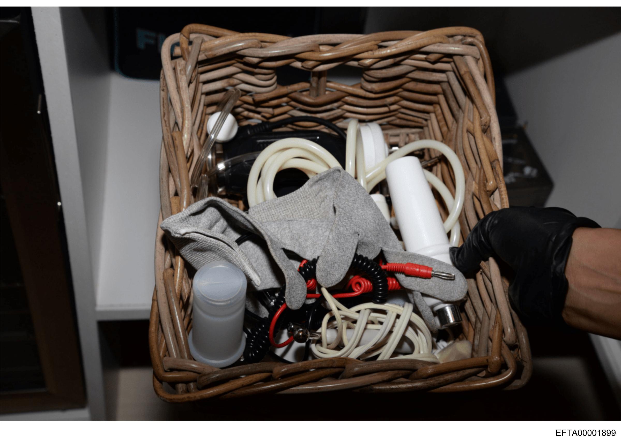 This is a close-up photograph showing the interior of a wicker basket. The basket contains various items that appear to be related to electronics or technical work. Among these items are several cables and wires, some with connectors attached, as well as what looks like small mechanical parts or components. In addition to this, there is a glove placed inside the basket. There is no visible text, people, specific locations, or significant objects that can be discerned from this image. The focus of the photograph seems to be on the items contained within the basket, suggesting a theme related to work or hobby involving technical components or repairs.
