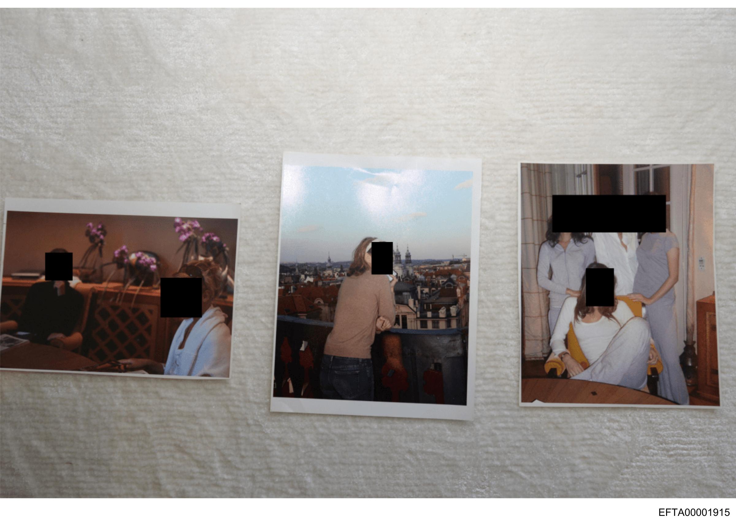 This is an image featuring four photographs pinned to a fabric surface with light-colored lines delineating the panels. In the top left photo, there's a landscape view with a body of water and clouds in the sky. The top right photo shows an indoor scene with blurred figures; one person appears to be seated while another is standing. The bottom left photograph has a person wearing a light-colored shirt facing away from the camera, overlooking what seems to be an architectural structure or urban scenery. In the bottom right image, there's a group of people sitting around a table with blurred figures in the background; however, their faces are obscured by black rectangles. There is visible text at the top left corner of the image that reads "EXPO," suggesting that this might be part of an exhibition or showcase. The style of the image evokes the feeling of a physical scrapbook or photo album with its informal presentation and layout.