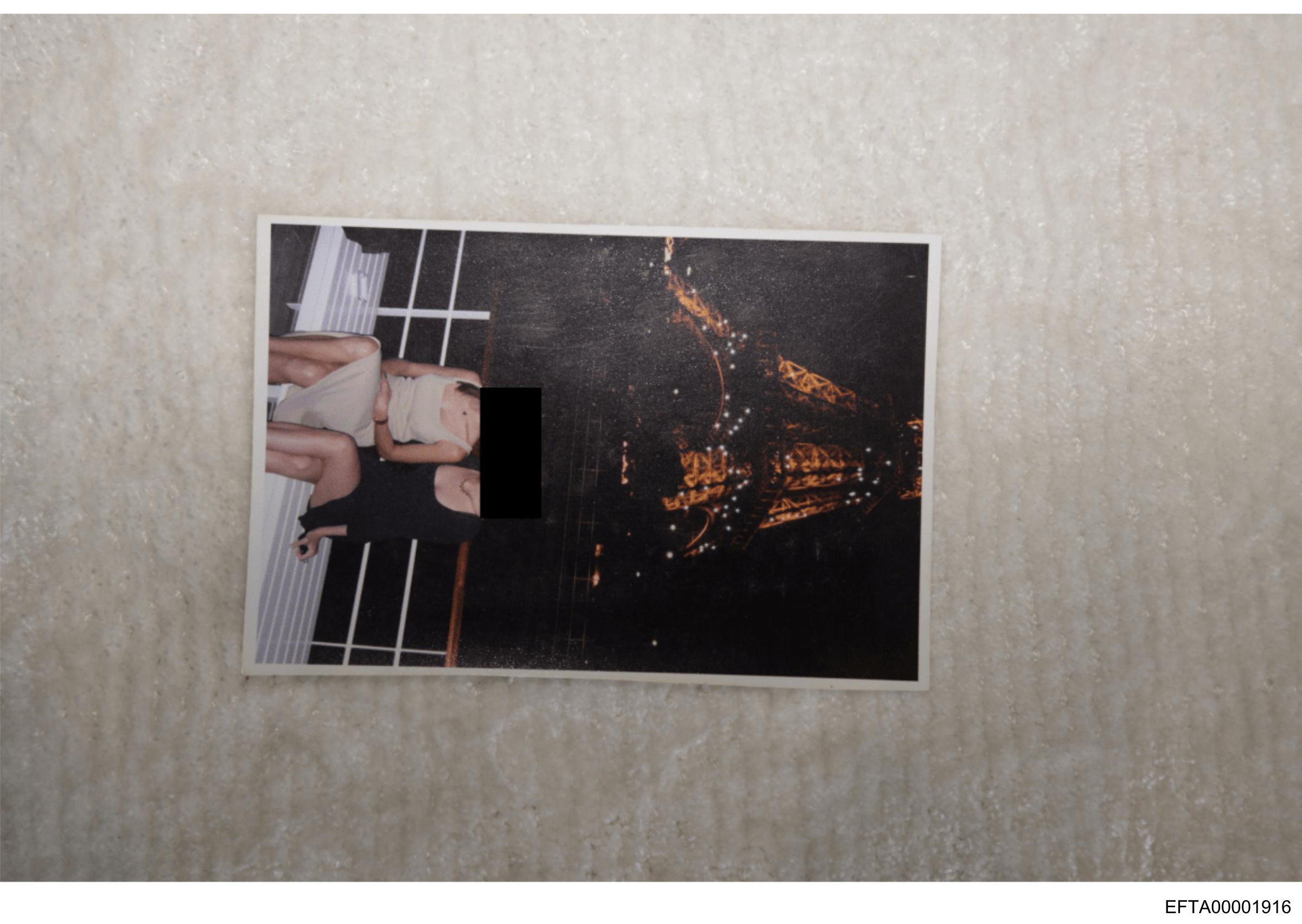 The image features a photograph placed on a surface that appears to be a table with a woven texture. The photograph captures an outdoor scene at night, possibly from a high vantage point such as a balcony or rooftop deck, given the presence of a railing. It depicts two people sitting together, enjoying what seems to be a view over a cityscape illuminated by lights. The photo has been altered with graphical elements; there are lines and shapes superimposed on it, creating a layered effect that obscures parts of the original image. There is visible text in the bottom right corner of the photograph, which reads "ETX," but without additional context, its significance remains unclear.