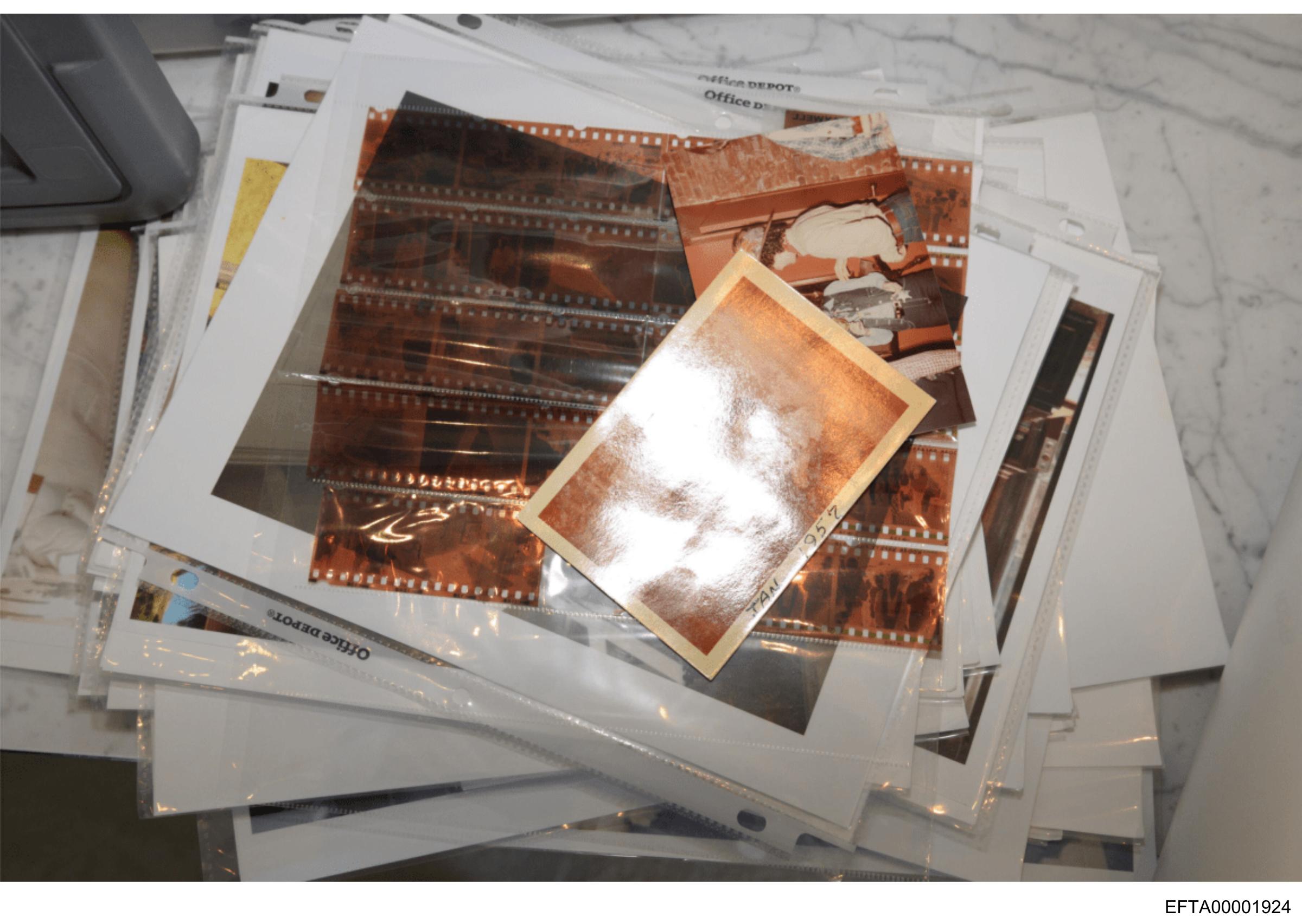 The image shows a collection of photographs and other printed materials spread out on a surface with a marble pattern.