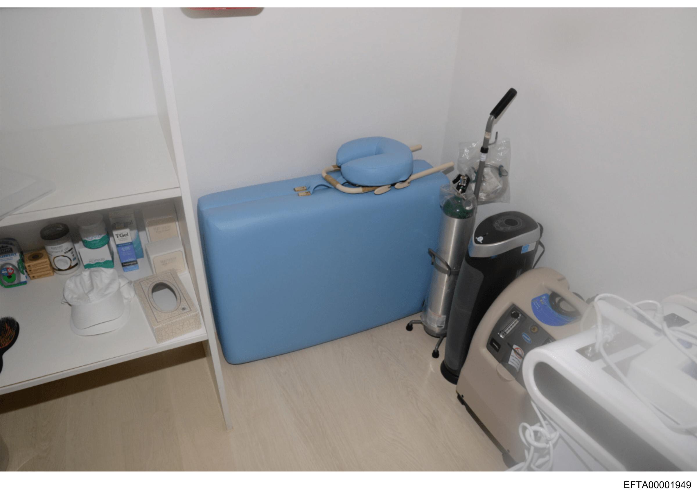 The image shows an indoor setting that appears to be a storage area or room with various items arranged along the walls. Prominently featured is a blue object with handles, which could possibly be a piece of exercise equipment or a large case. There are also other objects including what seems to be a white appliance on wheels, likely a cleaning device such as an upright vacuum cleaner. On the wall, there's a shelf containing bottles and containers, suggesting this might be used for organizing tools, chemicals, or supplies. The text "EX-5" is visible in the lower right corner of the image within a black square border. The overall style of the image is candid, capturing an everyday scene without any artistic or professional staging.