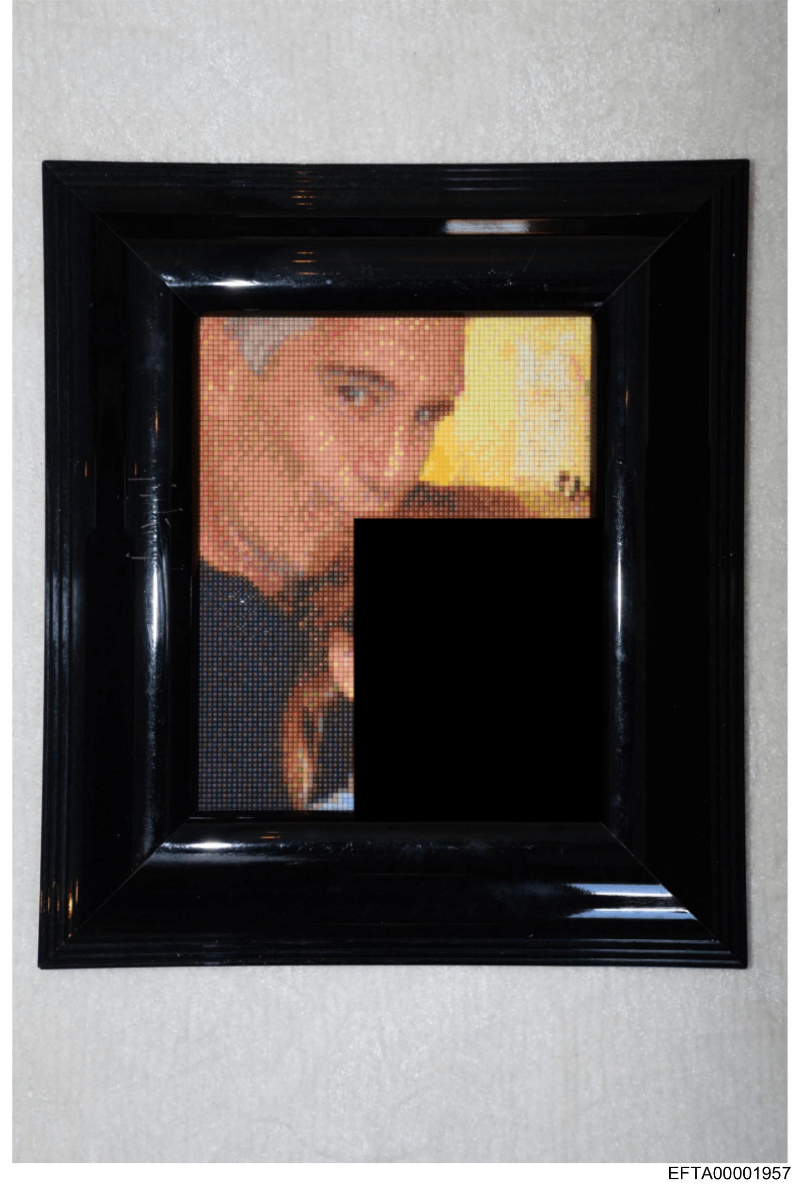The image shows a framed picture on the wall with what appears to be a pixelated effect obscuring the central figure's face and parts of their body.