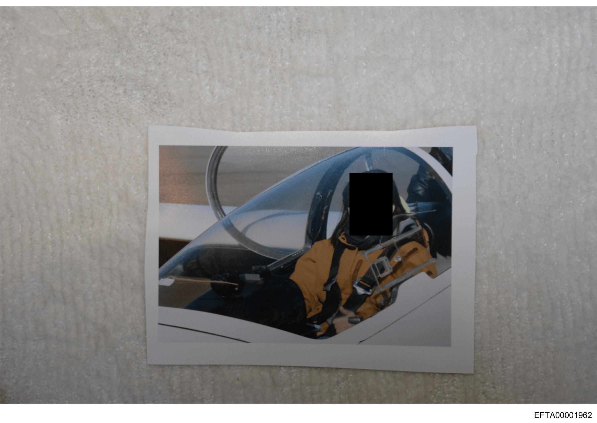 The image shows a Polaroid style photograph of an astronaut inside the cockpit of a spacecraft, with a blurred view through the cockpit window suggesting spaceflight. The astronaut appears to be wearing a full-body spacesuit with helmet securely fastened. There is visible text on the photo that has been redacted by blurring it out, indicating it's meant to protect personal or sensitive information. The background suggests the photo was taken indoors, possibly on a table or flat surface due to its stillness and centered placement.
