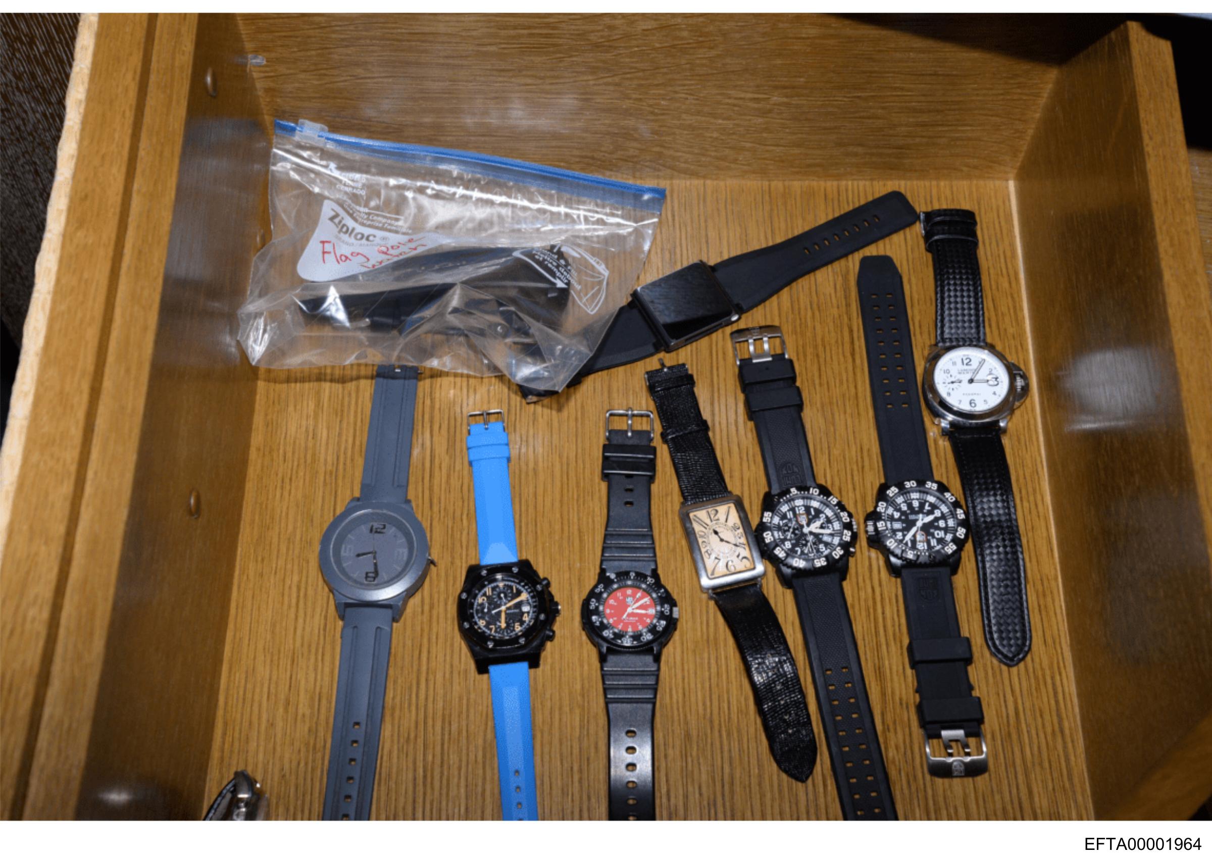 The image displays an open drawer filled with various watches. There are at least eight watches of different colors and styles; blue, black, silver, and one that appears to have a camo pattern. Each watch has a distinct strap color: black, white, red, and another in a muted tone. In the top left corner, there's a clear plastic bag with an illegible label. The drawer itself is light brown with a wooden texture. There are no visible texts or people in the image, and it doesn't provide any specific location details.