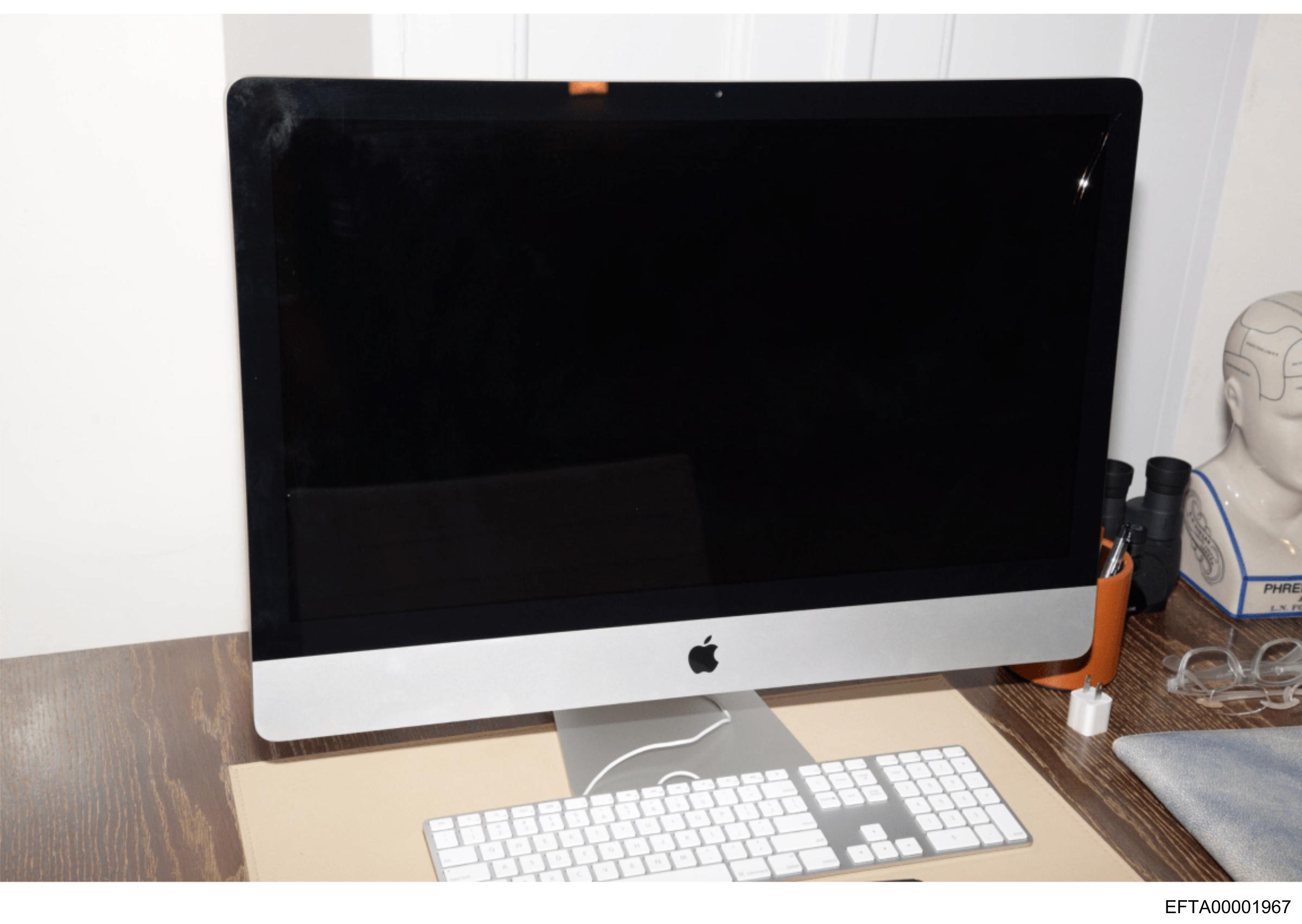 The image features a desktop computer setup with an Apple monitor that has its screen turned off.