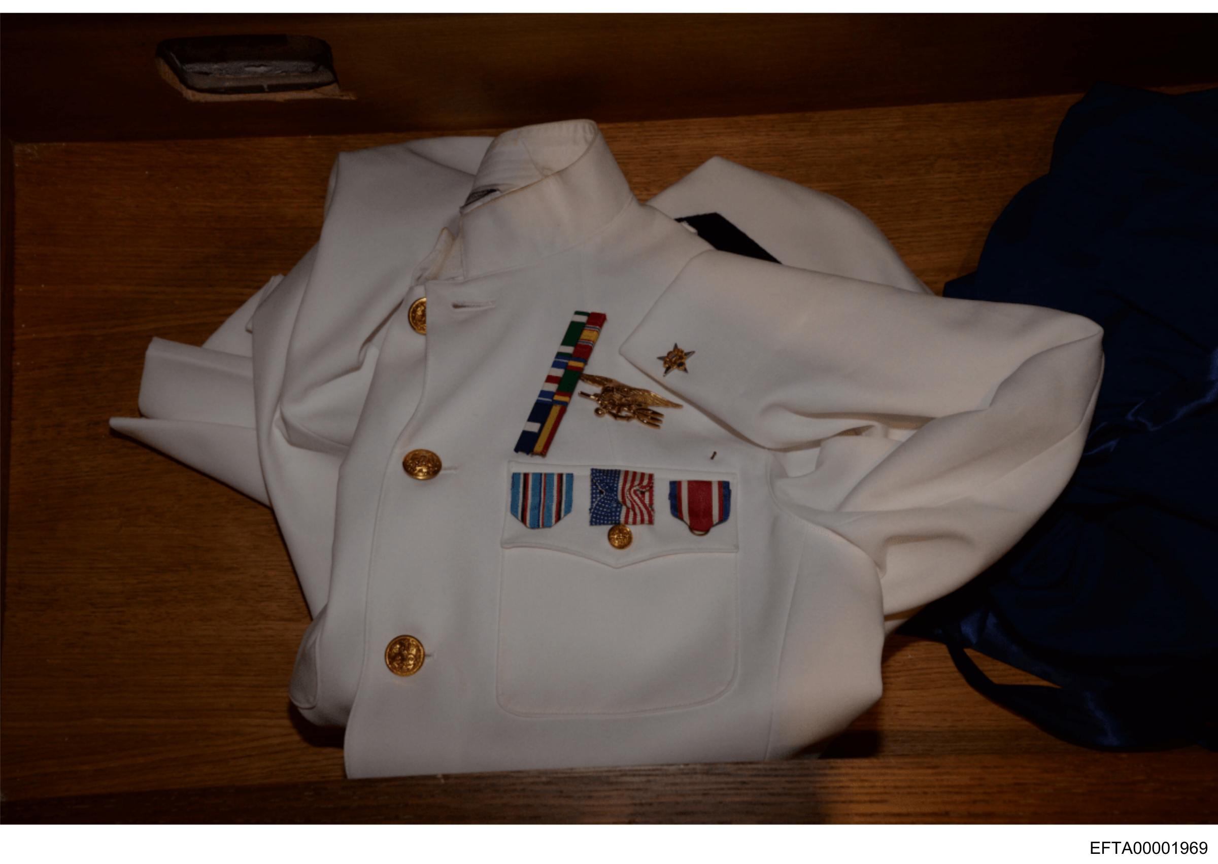 The image displays a white naval jacket with several decorations and medals on it, laid out flat on what appears to be a wooden surface.
