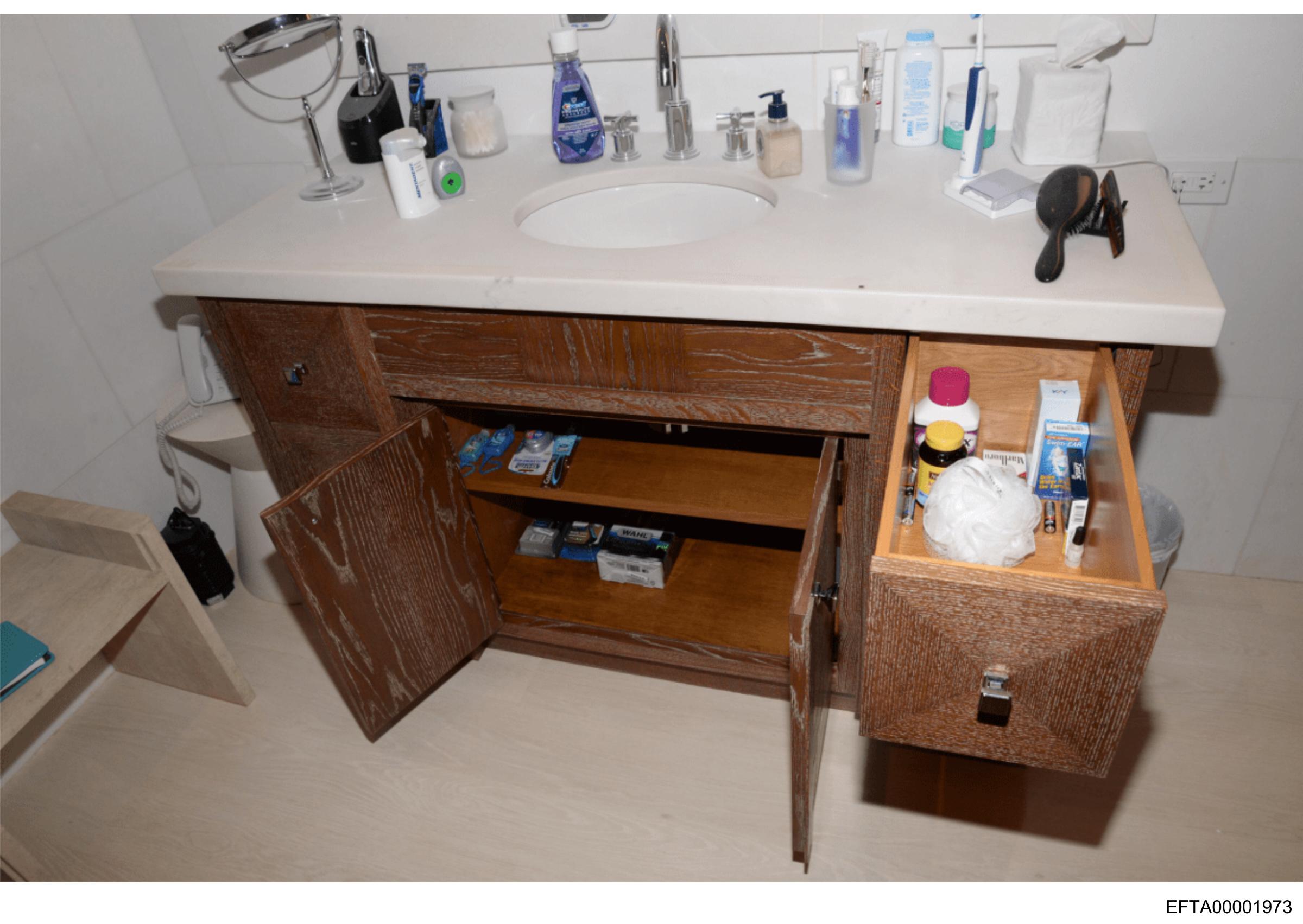 The image shows an open bathroom cabinet that appears to be a combination of wooden shelves and drawers with metal handles.