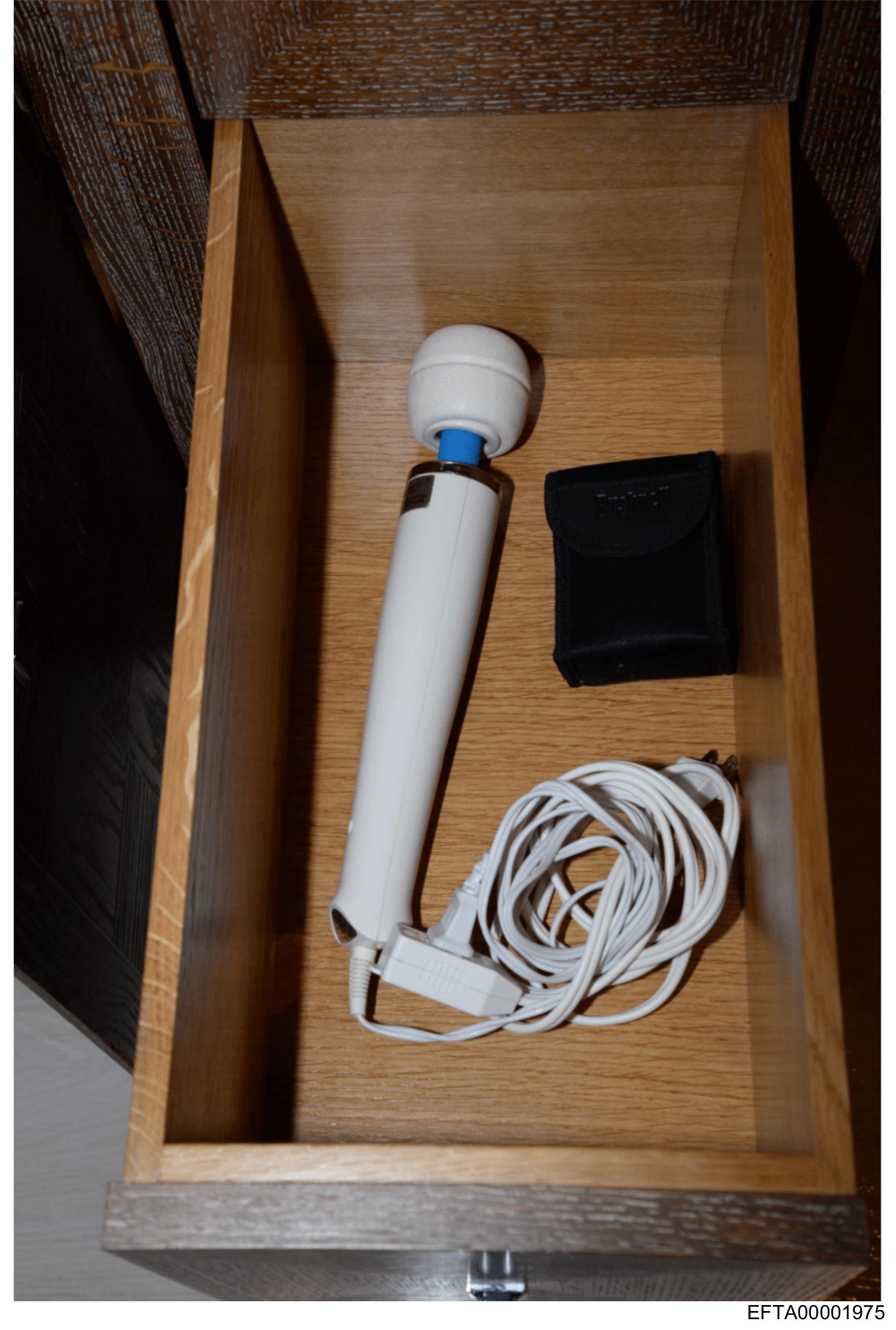 The image shows an open wooden drawer with a few items inside. There is a white electric toothbrush lying on its side towards the left of the frame. Adjacent to it, there appears to be a black case and some cables or cords wrapped up together, occupying the right side of the drawer. The background is out of focus but seems to be an interior setting, possibly a room with a window. There is no visible text on the items in the drawer.