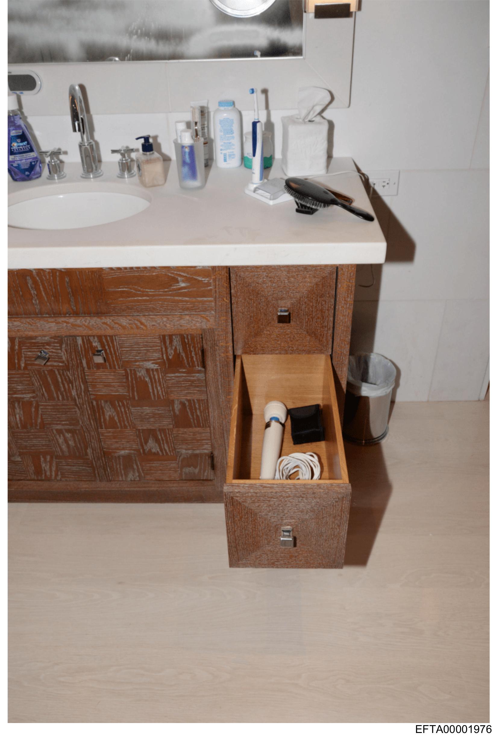 The image shows a close-up of an open drawer within a bathroom vanity.