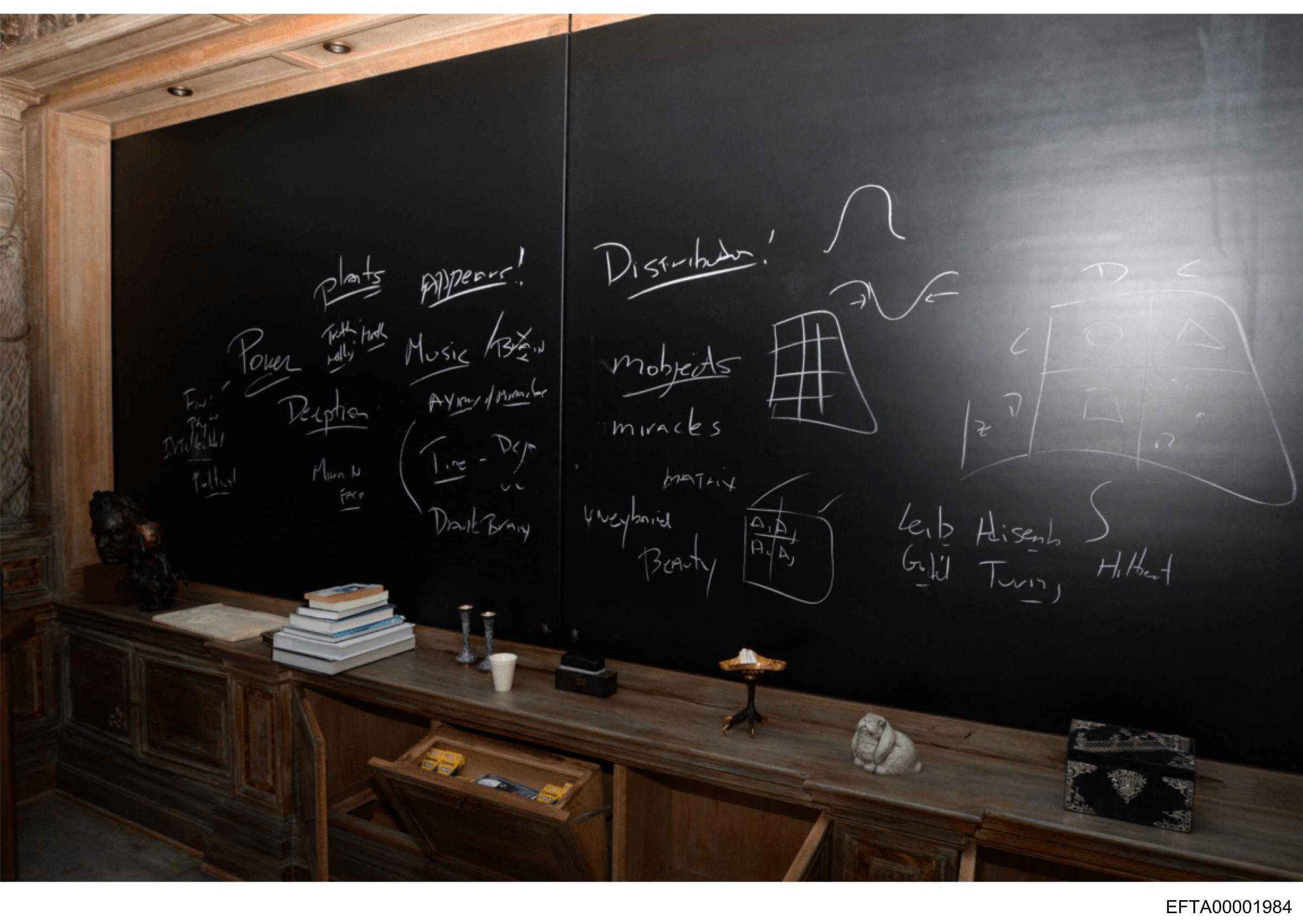 The image shows a blackboard with various handwritten notes and drawings on it.