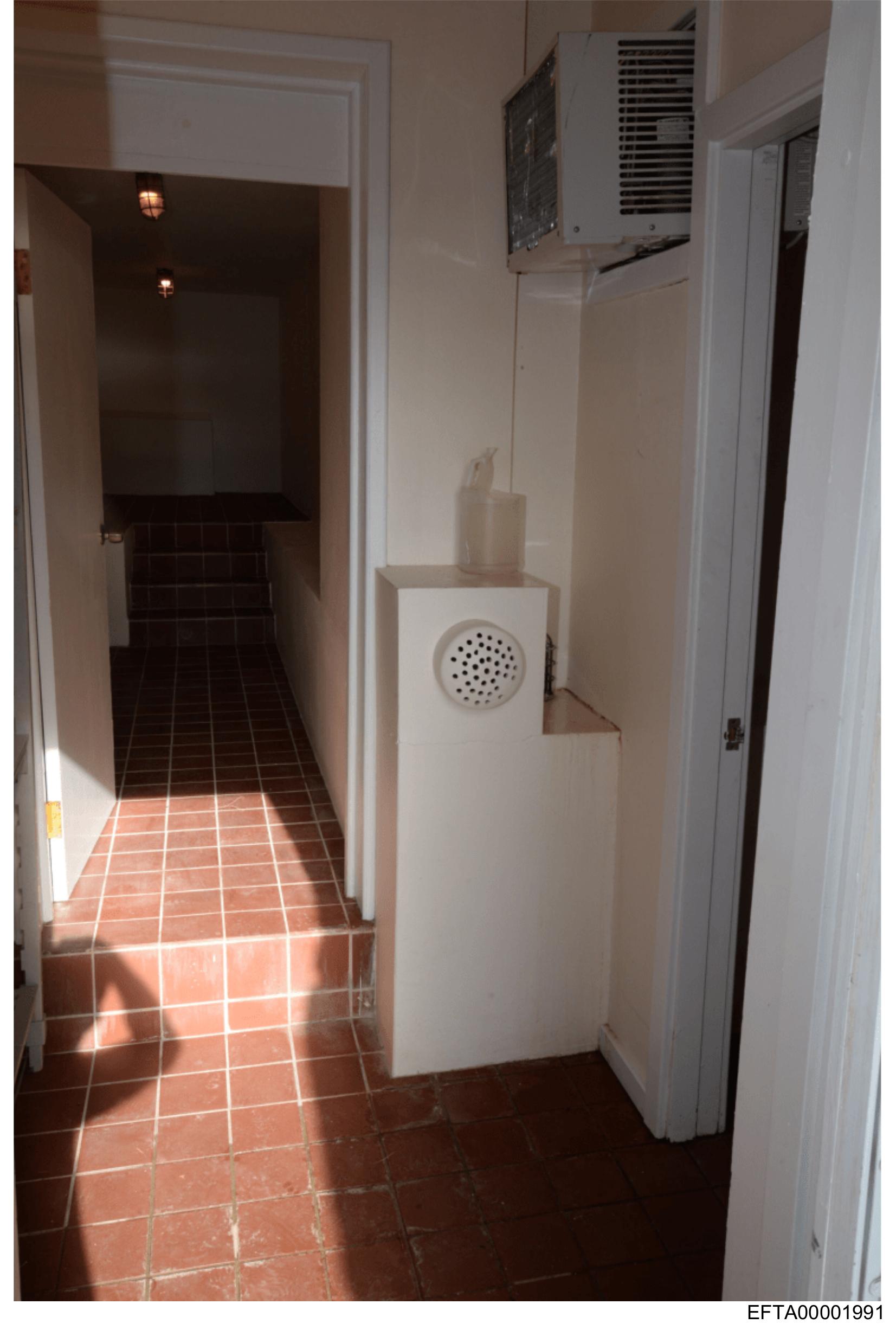 The image depicts an interior hallway with a tiled floor and walls that are painted in a pale color.