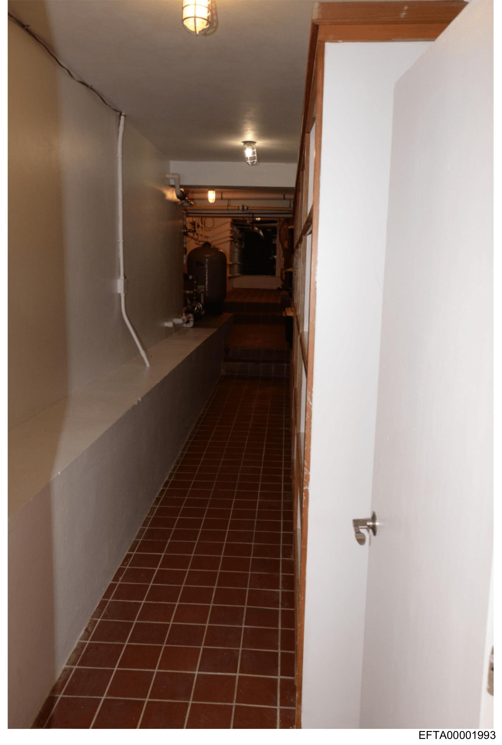 The image depicts an interior scene with a distinctive tile floor and walls that appear to be made of wood panels.