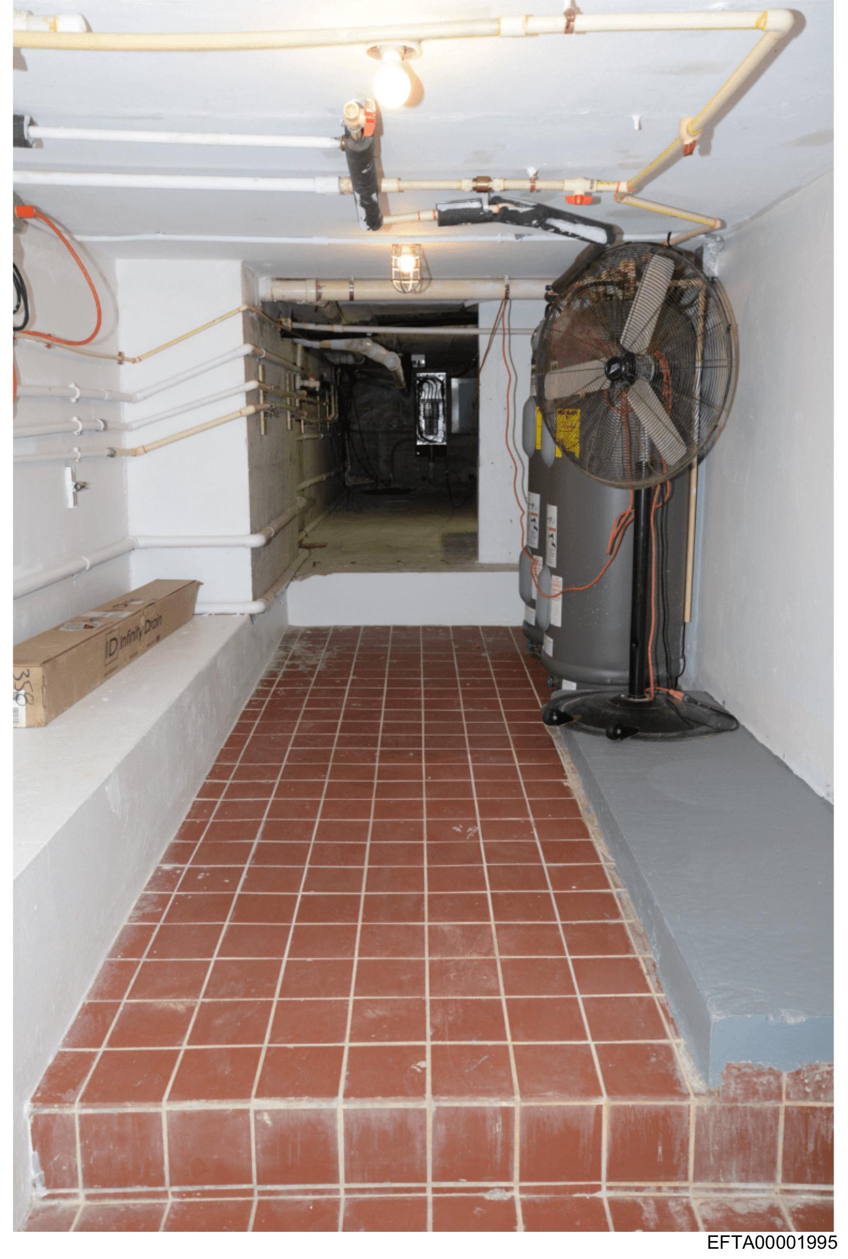 The image depicts a narrow indoor corridor with a tiled floor and walls, which appears to be an underground passage or utility area.