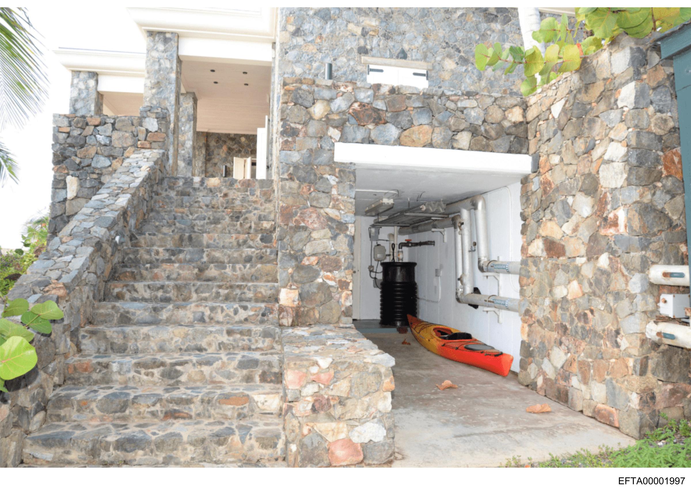 The image shows a building with stone facade and a prominent set of concrete stairs leading to its entrance. There is an open garage door on the side of the structure, revealing an interior space with what appears to be a boat inside. The ground surface around the staircase and garage area looks like it could be a parking lot or driveway. In the foreground, there are various plants, suggesting that this building might be located in a landscaped area or close to greenery. There is no visible text, people, or specific locations identifiable from the image alone. The style of the photograph seems candid, possibly intended to showcase a feature of the property, such as the boat storage or the stone construction.
