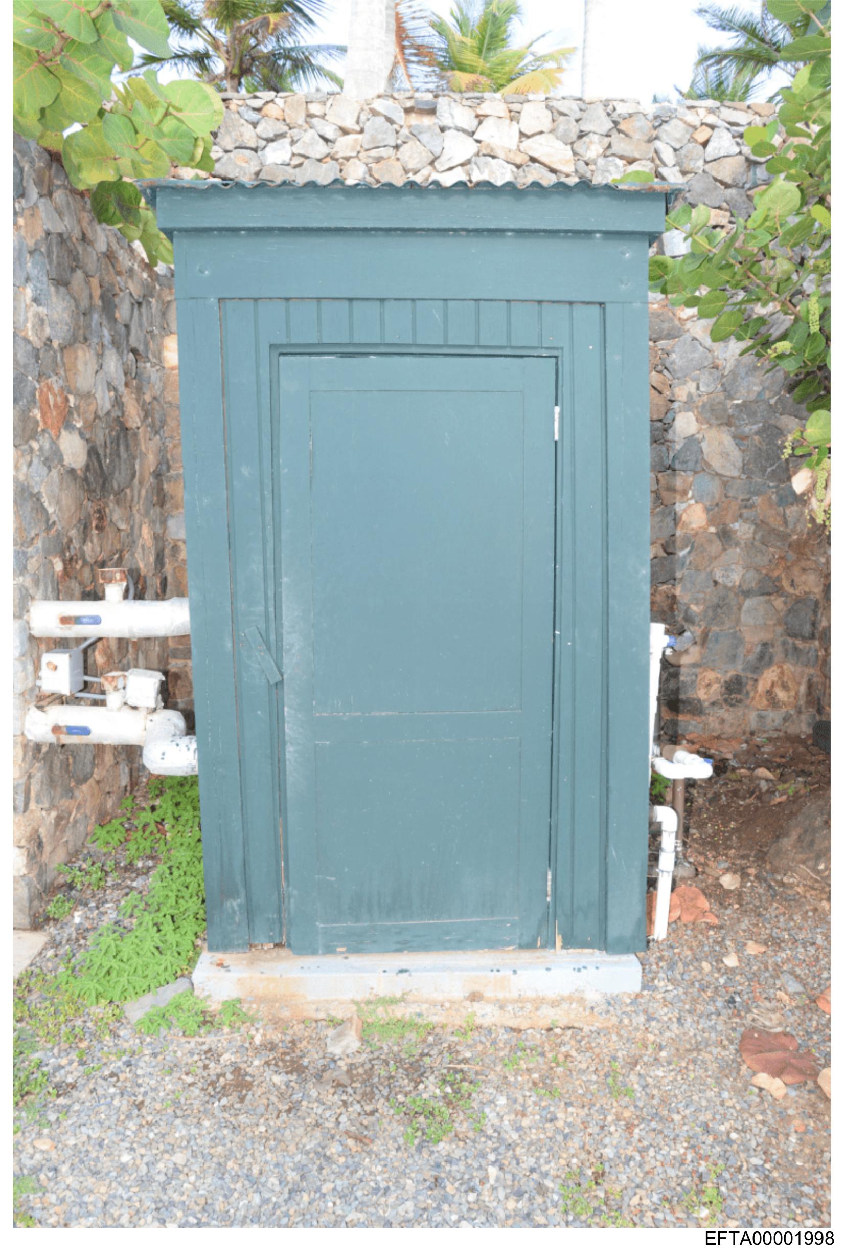The image shows a green structure that appears to be an outdoor storage unit or shed. It has a door with vertical slats and is situated on a concrete base. There are no people visible in the photo. The background features a natural landscape with vegetation, rocks, and what looks like a stone wall. The setting suggests it could be located near a beach, given the presence of pebbles and the style of the building.