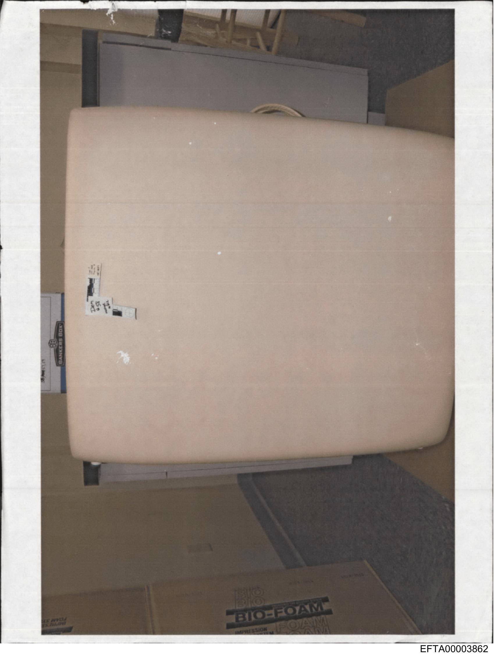 The image shows a white, rectangular object that appears to be an appliance with its side facing the viewer. There are two visible labels on the object: one near the top left corner and another towards the bottom right. The text on the top label is too small to read clearly, but it includes some numbers and possibly words. The lower label has a bar code and several lines of smaller text. In the background, there's a glimpse of other objects or materials, including what seems to be a cardboard box with writing on it. There are no people visible in this image.