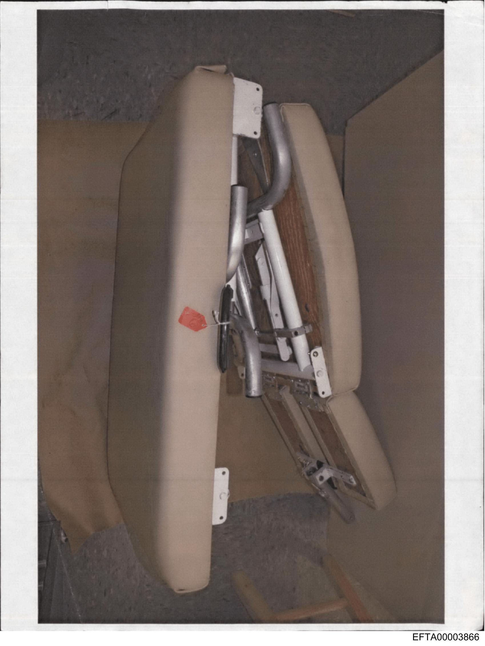 The image shows a motorized wheelchair partially disassembled with its seat removed. The frame appears to be metallic and is missing the usual cushion on the seat area. There are no texts, people, or specific locations identifiable from this image. The style of the photo seems candid, possibly taken in a storage or maintenance environment, as suggested by the cardboard box that the wheelchair is leaning against.