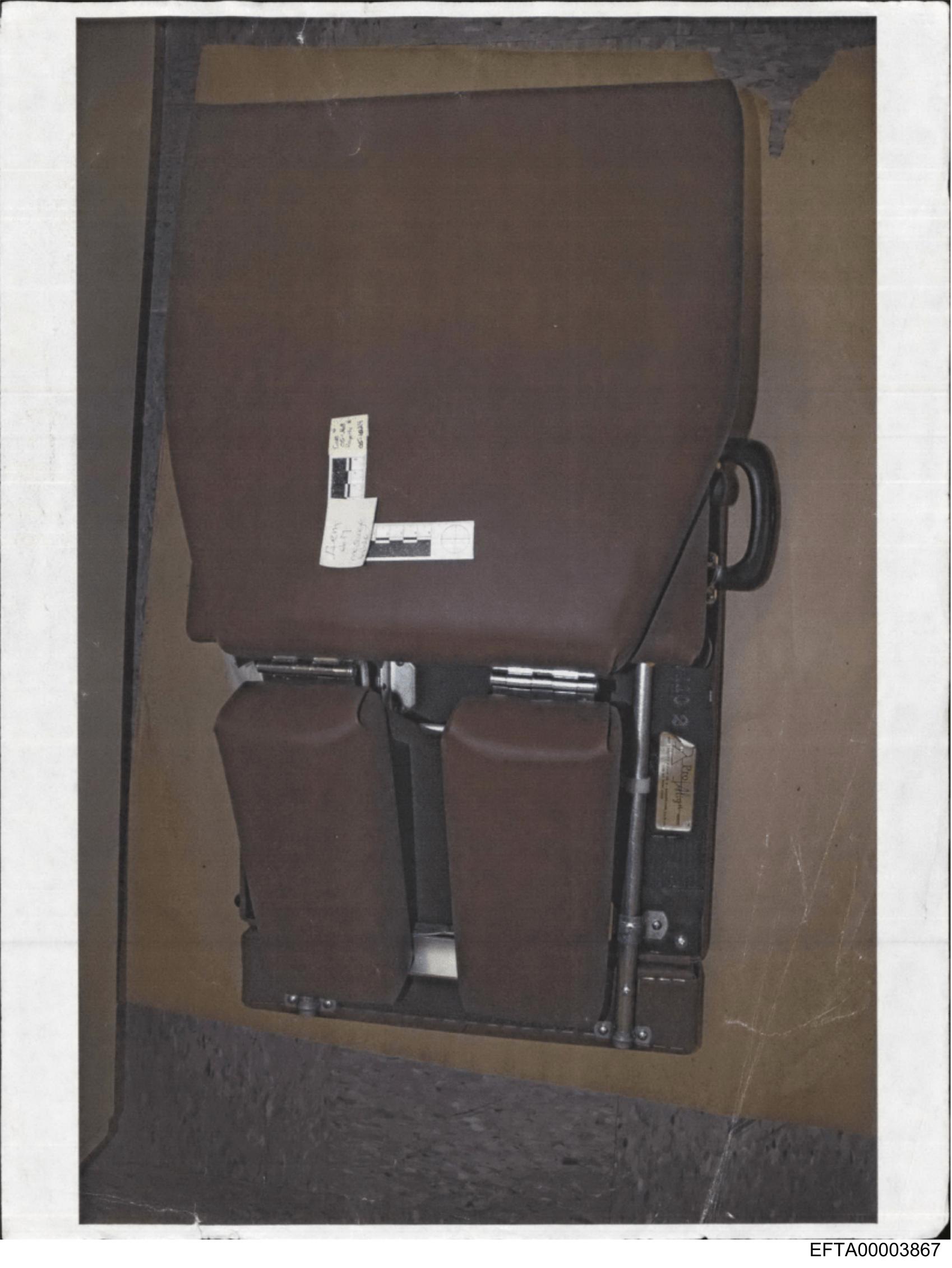 The image shows a close-up view of what appears to be an airplane seat. The seat is upholstered with a brown material that looks worn or used, suggesting it may have been removed from service for repair or replacement. There are no visible texts or markings that provide additional information about the location or context in which the photo was taken. The focus of the image is on the seat itself and its immediate surroundings; there are no people or identifiable locations present.