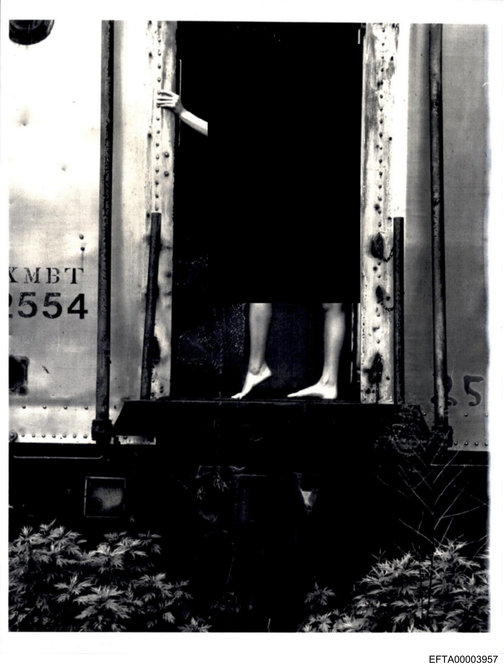 The image depicts a person leaning out of the open door of a train car with their legs hanging freely outside.