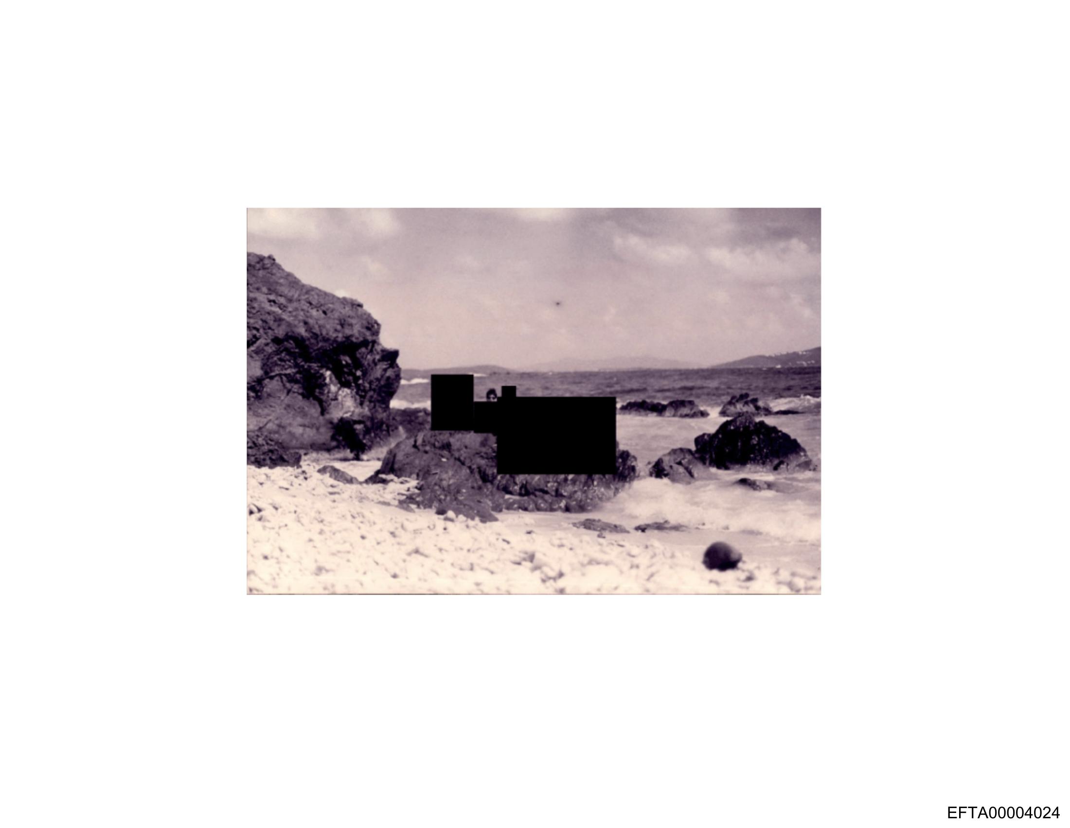 The image appears to be a photograph of a coastal scene. The central focus is on what seems to be an old building structure in the foreground, partially obscured by a large rectangular object that could possibly be another piece of architecture or machinery. In the background, there's a body of water with small waves and a cloudy sky, suggesting it might be overcast or early morning/late evening when the photo was taken. There are no texts visible in the image. The photograph itself has a grainy texture, which is characteristic of images printed on paper from film sources.