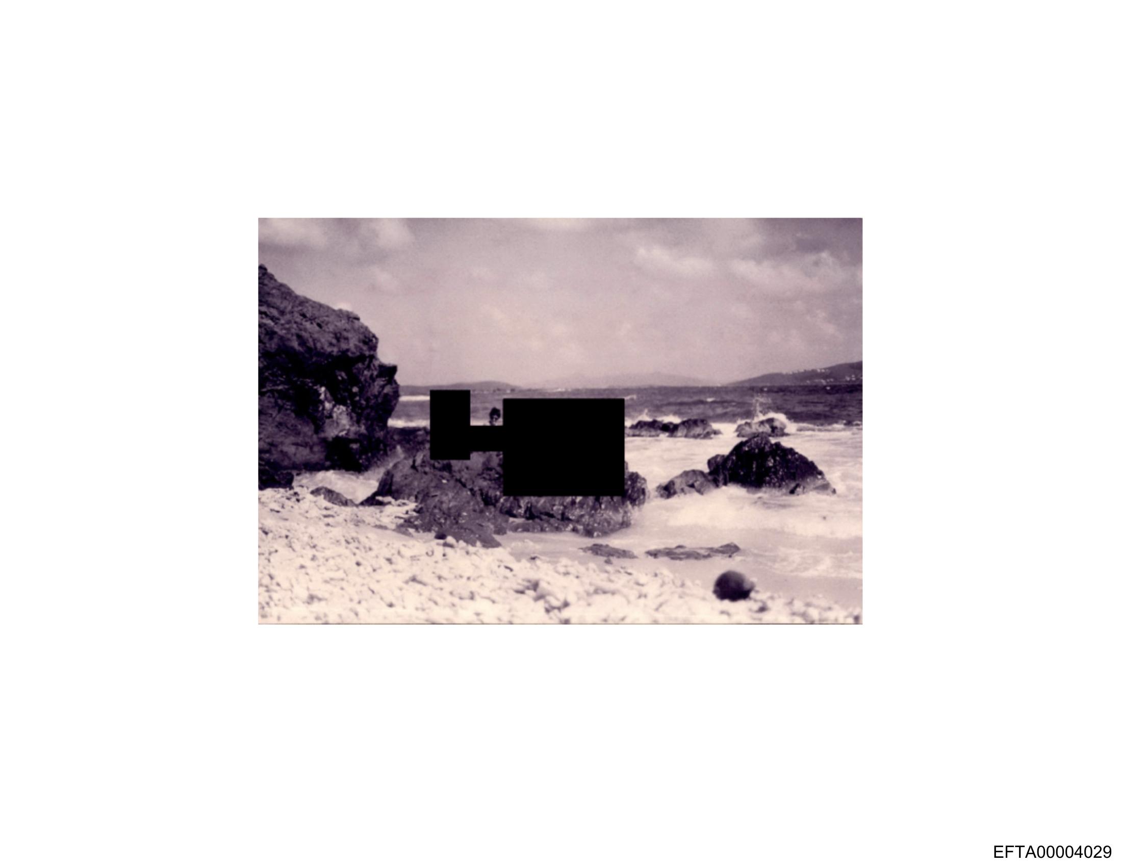 The image appears to be a vintage photograph with an overlay of a modern digital filter, possibly from a smartphone application. In the foreground, there is a blurred, pixelated area that seems out of focus, drawing attention due to its contrast with the rest of the scene. Beyond this obscured part, the background shows a natural landscape featuring water and what appears to be a rocky coast or beach. There are no texts visible in the image. The photo has an aged look, which could suggest it was taken quite some time ago and possibly represents a memory from the past.