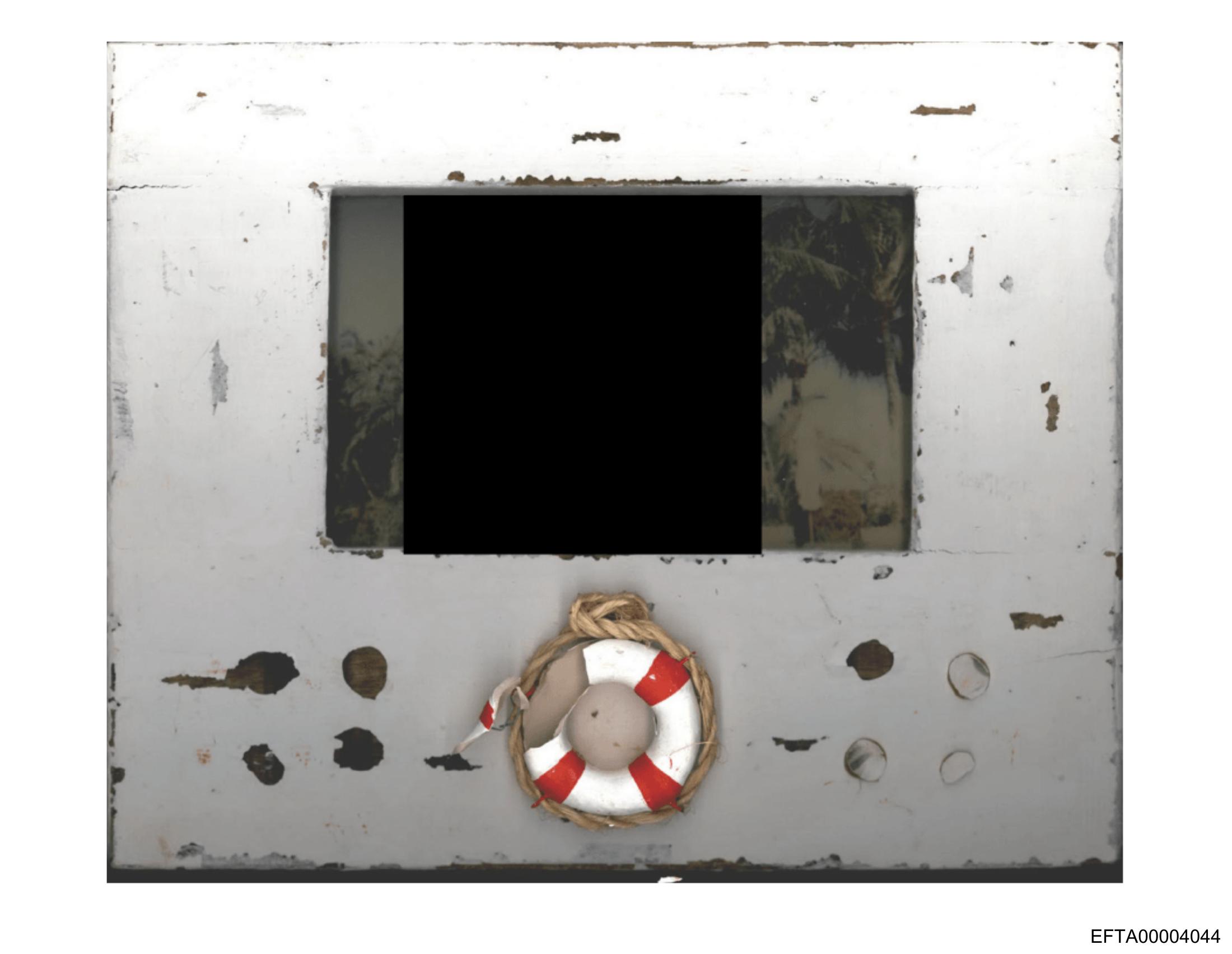 The image appears to be a photograph of an old, possibly dilapidated structure with a rectangular shape and a vertical orientation. The structure has several holes or windows on its surface. There is a small white buoy attached to the right side of the structure, near the top. The background is indistinct but seems to suggest an outdoor setting with natural elements like trees or foliage. The overall tone of the image is dark and muted, giving it a somewhat eerie or abandoned feel.