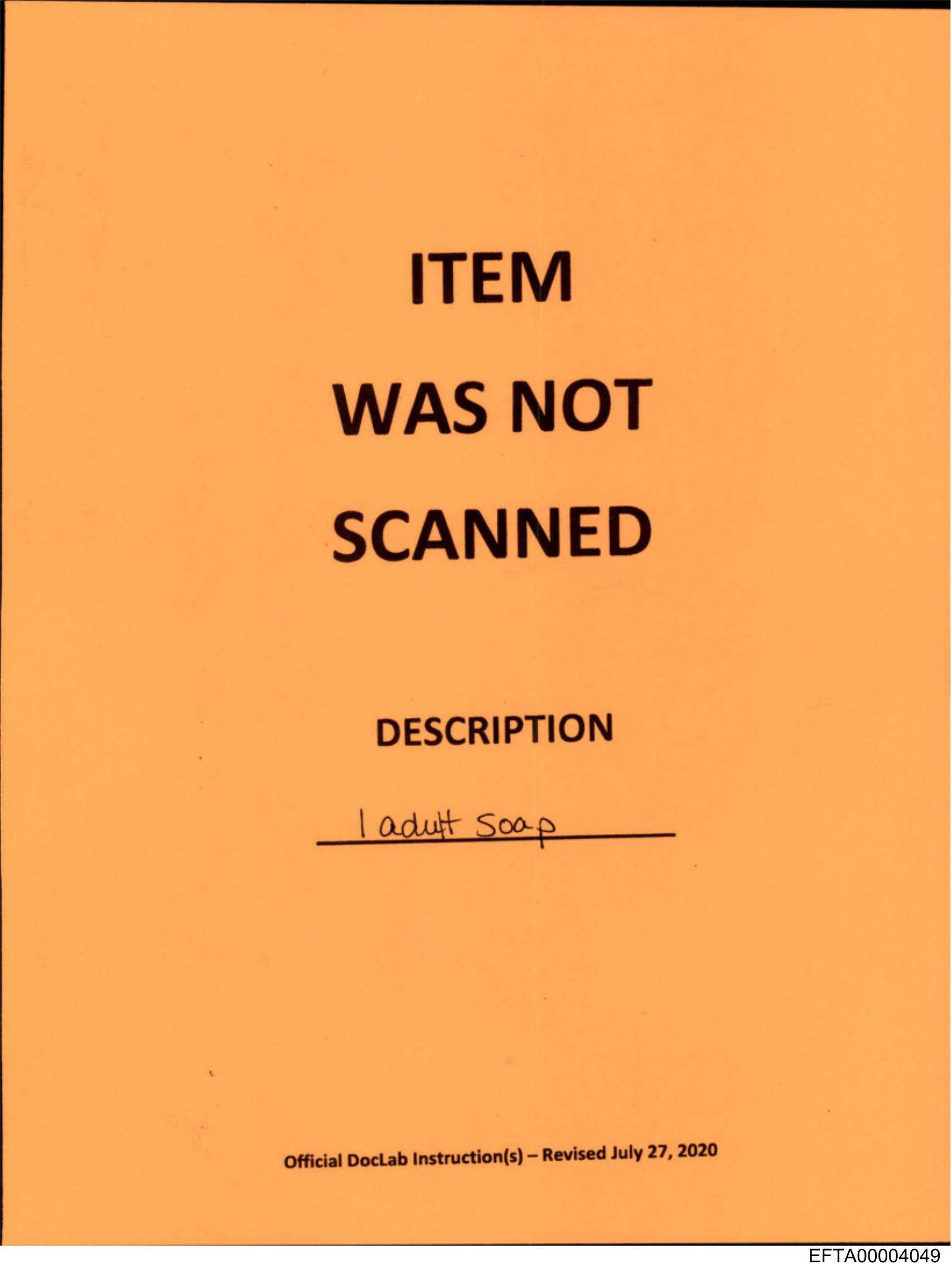The image displays a yellow notice with printed text and handwritten annotations. The text on the top half of the paper reads "ITEM WAS NOT SCANNED" in bold, capital letters, indicating that a procedure was not followed as expected. Below this, there is a description provided by hand, which says "Liquid Soap Bottle," specifying what the item is that failed to be scanned. The note also includes an expiration date of "7/16/2020," suggesting when it should no longer be considered valid or relevant. At the bottom right corner, there's a signature, likely indicating the person who acknowledged the issue. The paper appears to be placed in front of another document or item that is not visible due to its position.