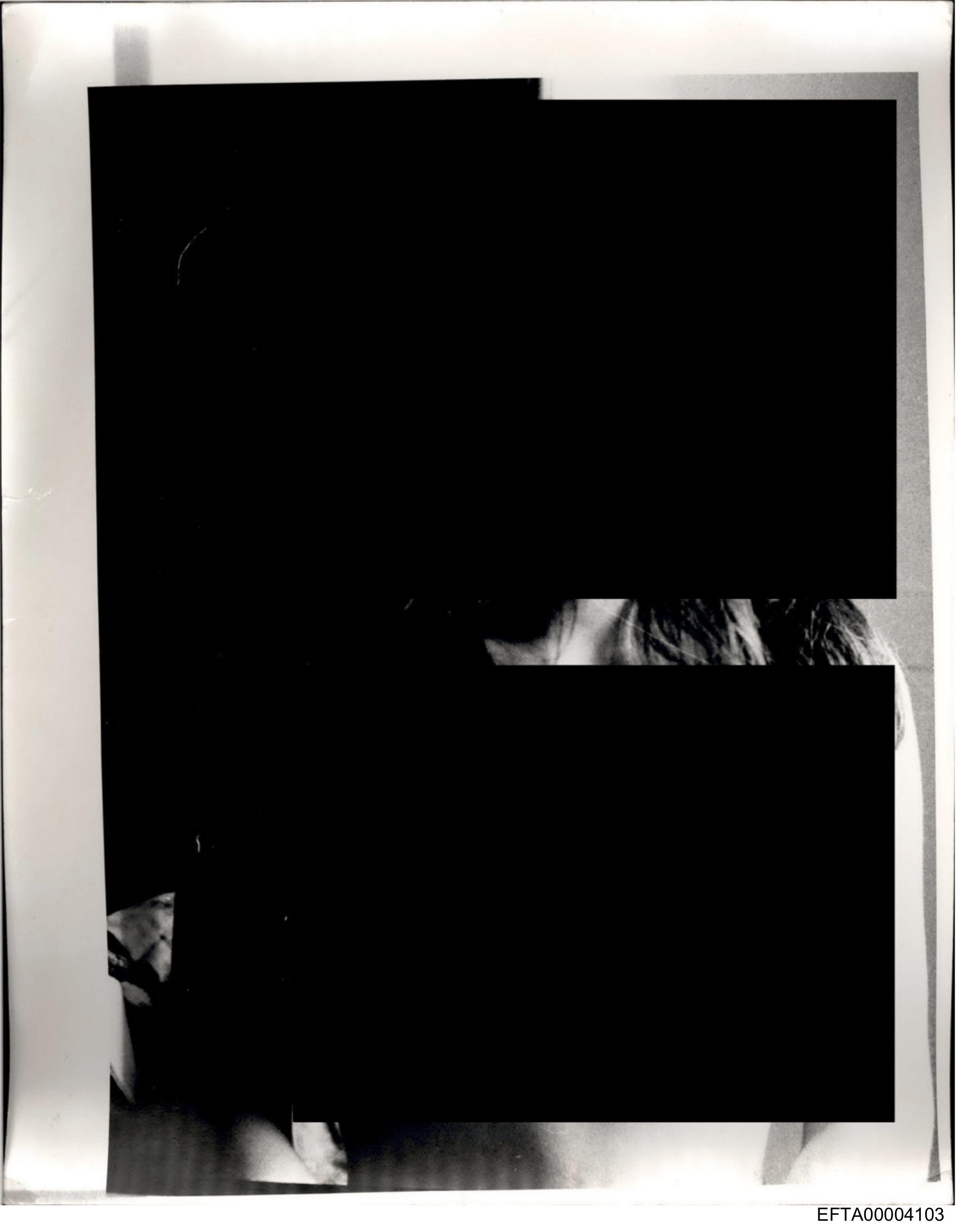 The image appears to be a black and white photograph that is either damaged or purposely obscured with what looks like ink blots covering the central part of the frame.