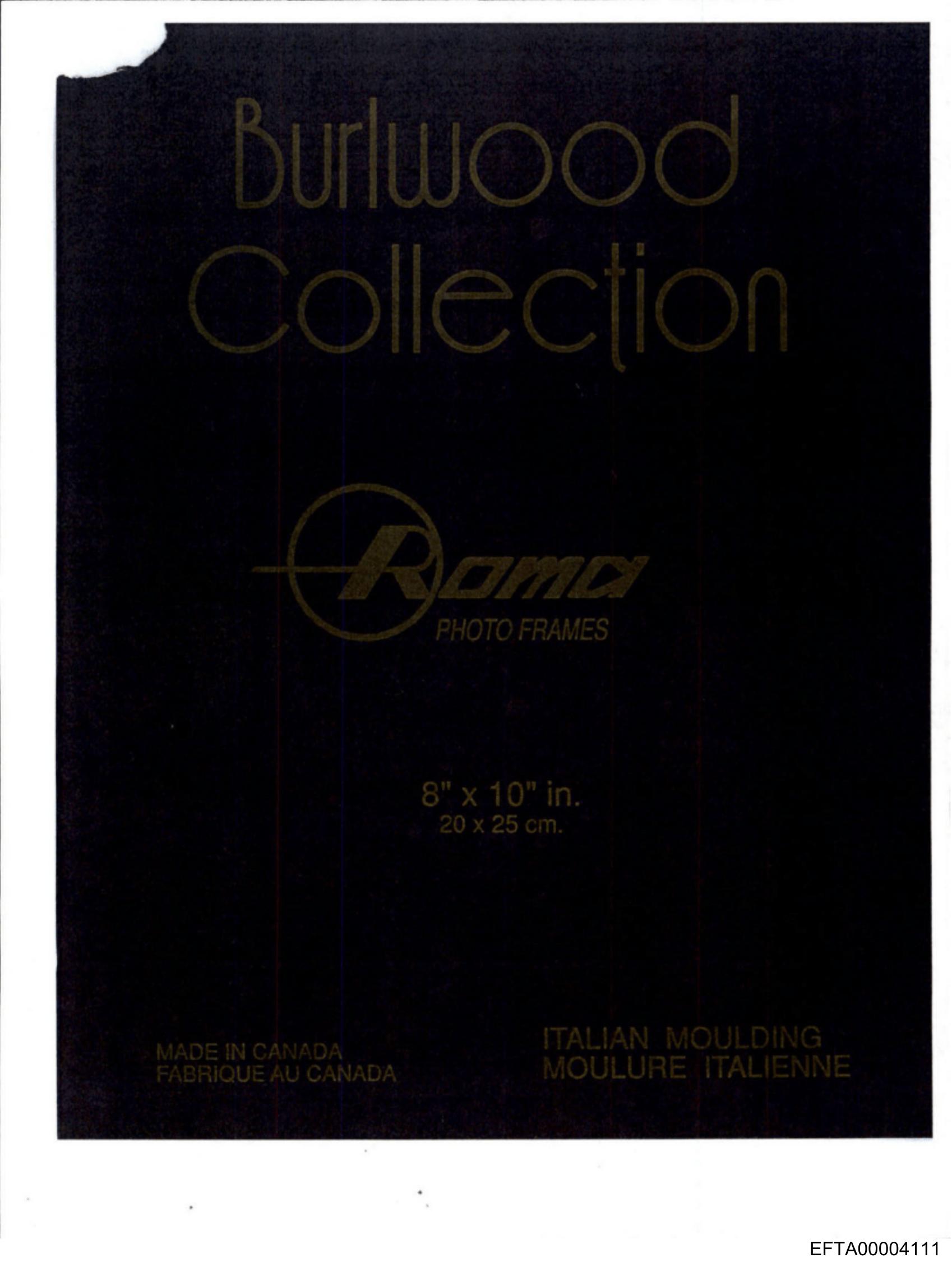 The image is a close-up of what appears to be the corner of a magazine page. The most prominent text reads "Burwood Collection" followed by a stylized logo that resembles a sunburst with radiating lines. Below this logo, there are measurements provided: "7 1/4 in x 10 1/2 in." Additional information includes "ROMA" which might indicate the brand or type of material used and also mentions "Italian Moulding" suggesting a decorative border made in Italy. The text at the bottom right corner is partially obscured but includes "Made in Canada," indicating that this item was manufactured in Canada.