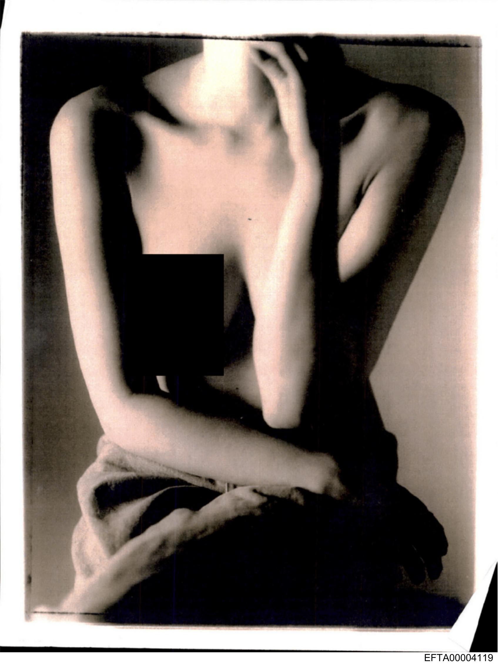 The image shows a side profile of a person sitting down with their head resting on one hand and the other hand touching their collarbone area. The individual appears to be wearing minimal clothing; however, key parts are obscured by what looks like a digital glitch or a watermark pattern that resembles pixelation. This pattern covers the central part of the torso from chest to waist, leaving only the limbs and head visible. The background is nondescript and does not provide additional context about the setting or location. There is no visible text within this image.