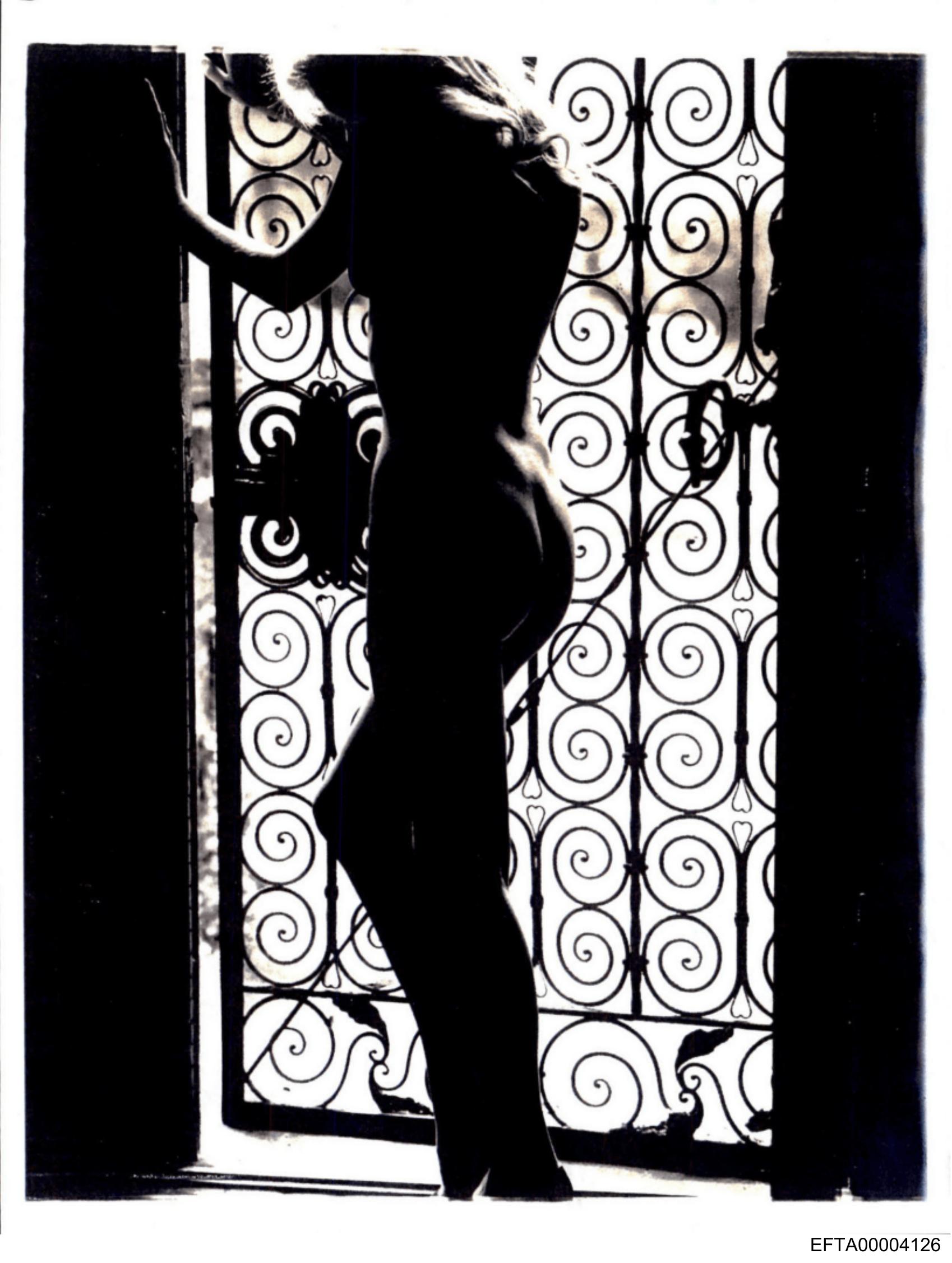 The image is a black and white photograph featuring a figure standing against an open window with iron bars. The person appears to be from behind, with their head turned slightly toward the camera, showing only part of their face in profile. They are partially naked, with one shoulder exposed by a transparent garment or fabric that flows down into a long train, draping onto the ground. The figure's pose suggests they might be leaning on the window sill, and their posture is relaxed yet poised. The iron bars have an elaborate scrollwork design, adding an artistic element to the scene. There is text visible in the image, though it's not fully legible; the first word begins with "S" and appears to be part of a title or description associated with the photograph. The overall style of the image suggests it may be related to fashion photography or an artistic portrait due to the use of light, shadow, and composition.