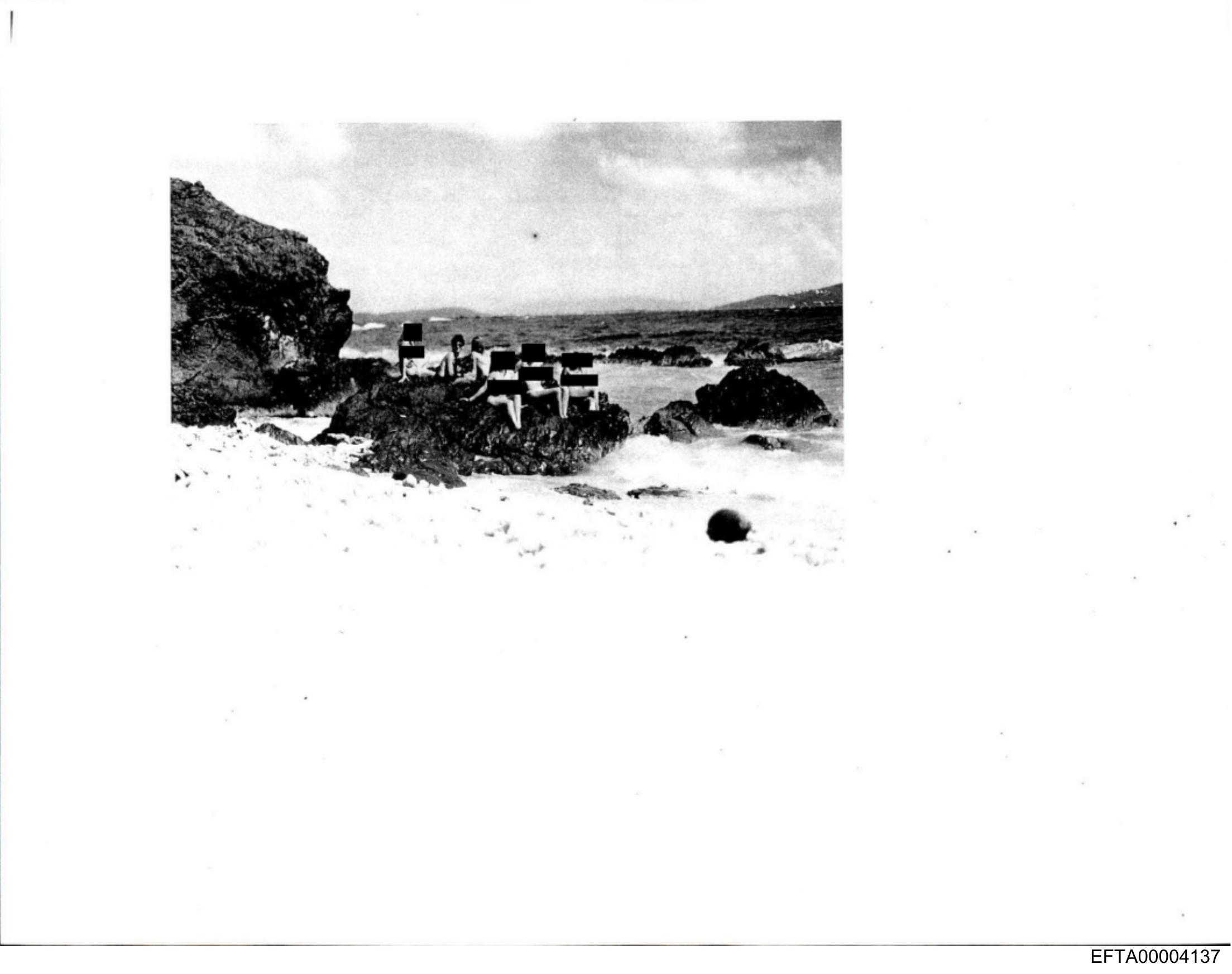 This is a black and white photograph depicting a beach scene with a rocky shoreline.