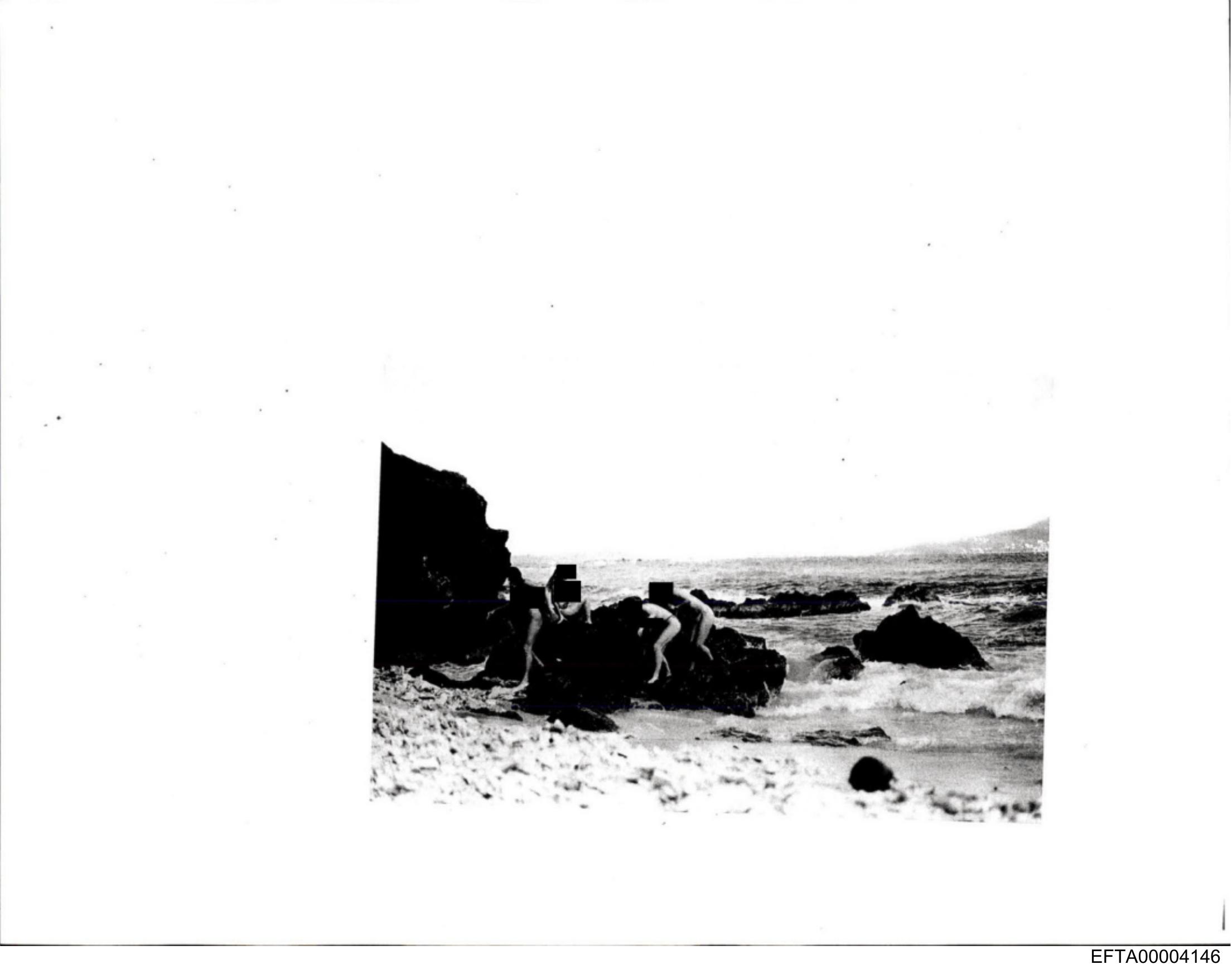 The image is a vintage black and white photograph that depicts a beach scene.