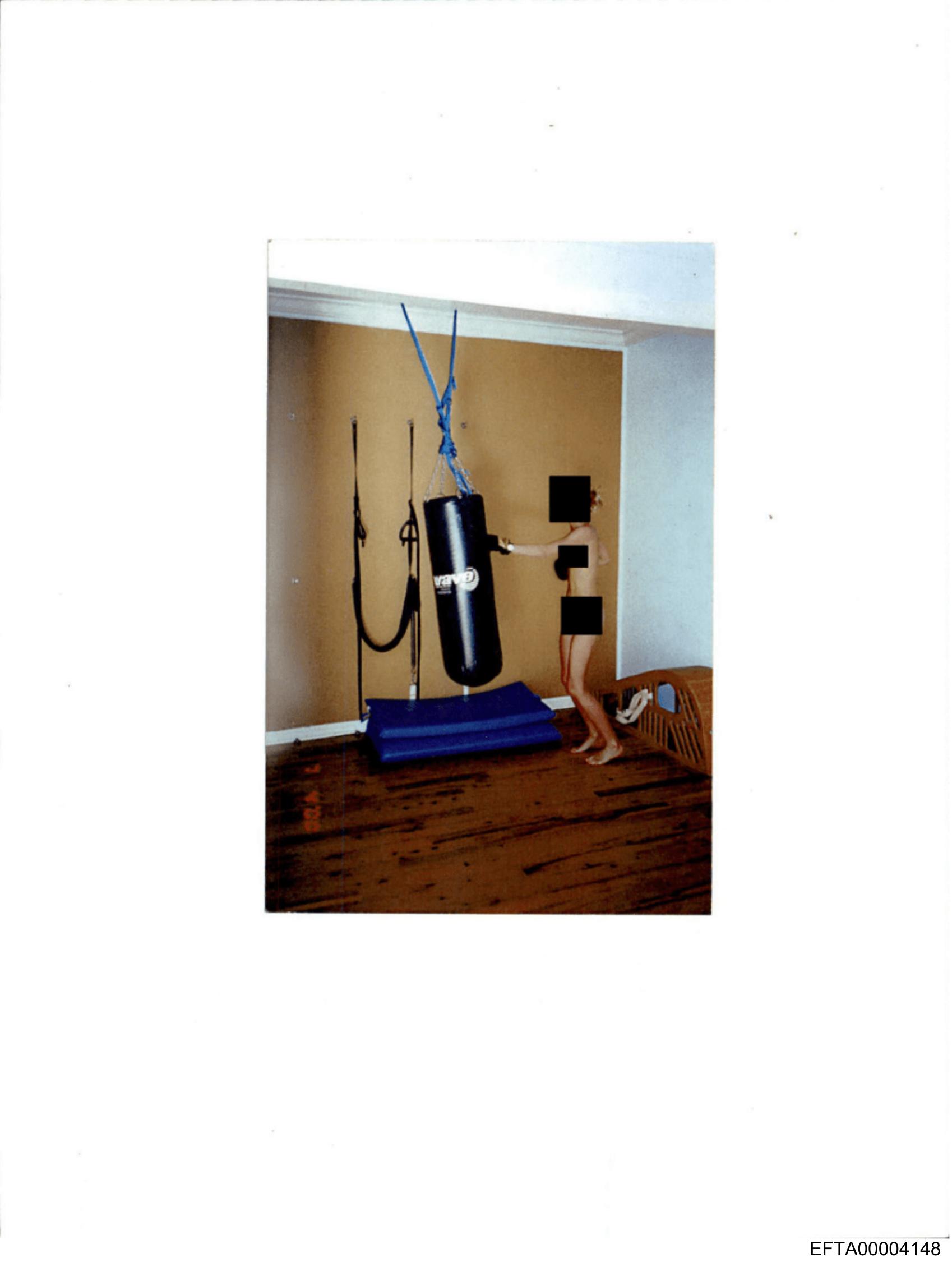The image shows a person in the midst of striking a punching bag with boxing gloves on. The person is obscured from view by their posture and the position of the gloves. To the left of the scene, there's an exercise weight bench and what appears to be a dumbbell rack. The setting seems to be a home gym or workout room, as indicated by the simple furnishings and personal training equipment. The image is slightly blurry, possibly due to movement or camera shake during the shot.