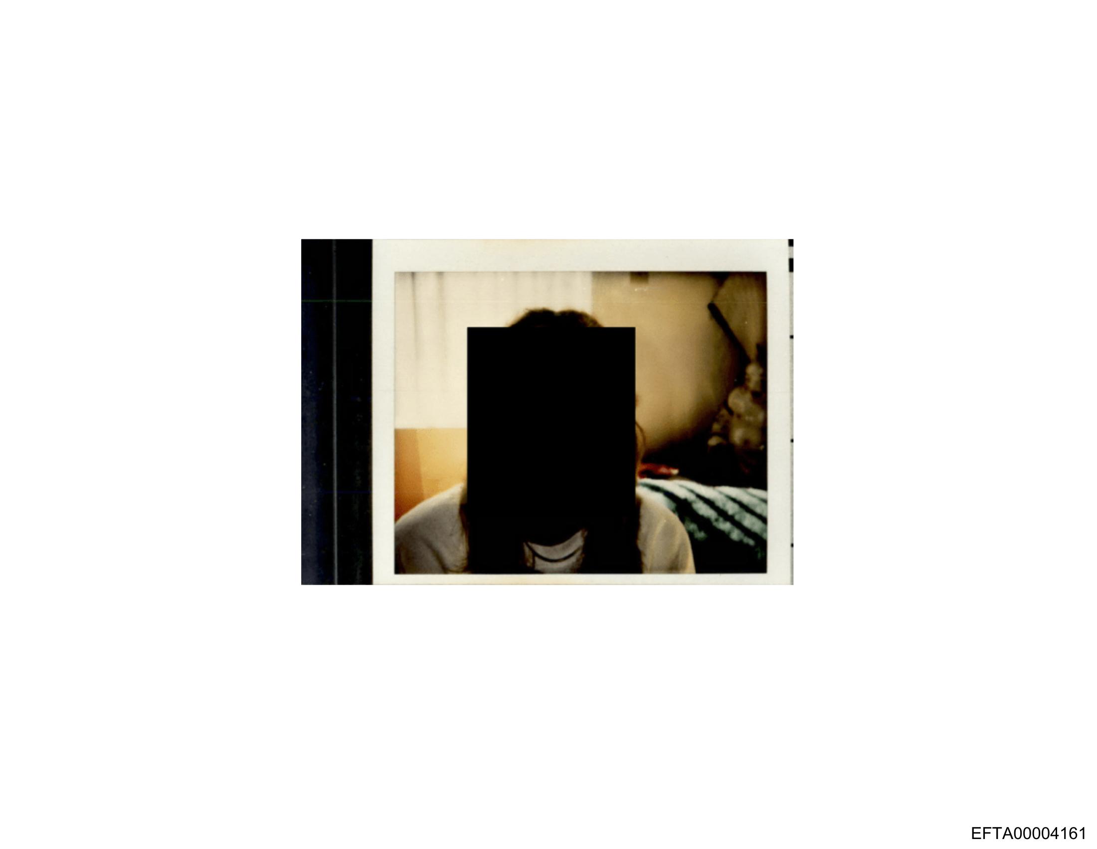 The image is a photograph within a photograph, with an overlay of a red rectangle obscuring the face of a person. The central figure appears to be seated on a bed with curtains in the background, suggesting an indoor setting. There is no visible text on the image. The style of the photograph and the overlay give it a layered or double exposure effect.