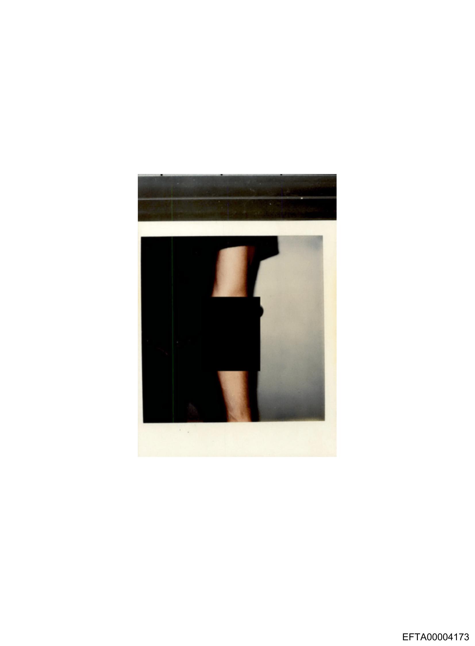 This is a small, rectangular black and white photograph within an image of another photograph on paper. The original photograph shows the lower part of a person's body, with their right leg partially clad in dark clothing. There are no visible texts or distinguishing features that provide additional context about the location or identity of the person depicted. The style of the photograph is realistic and appears to be taken casually without artistic staging.