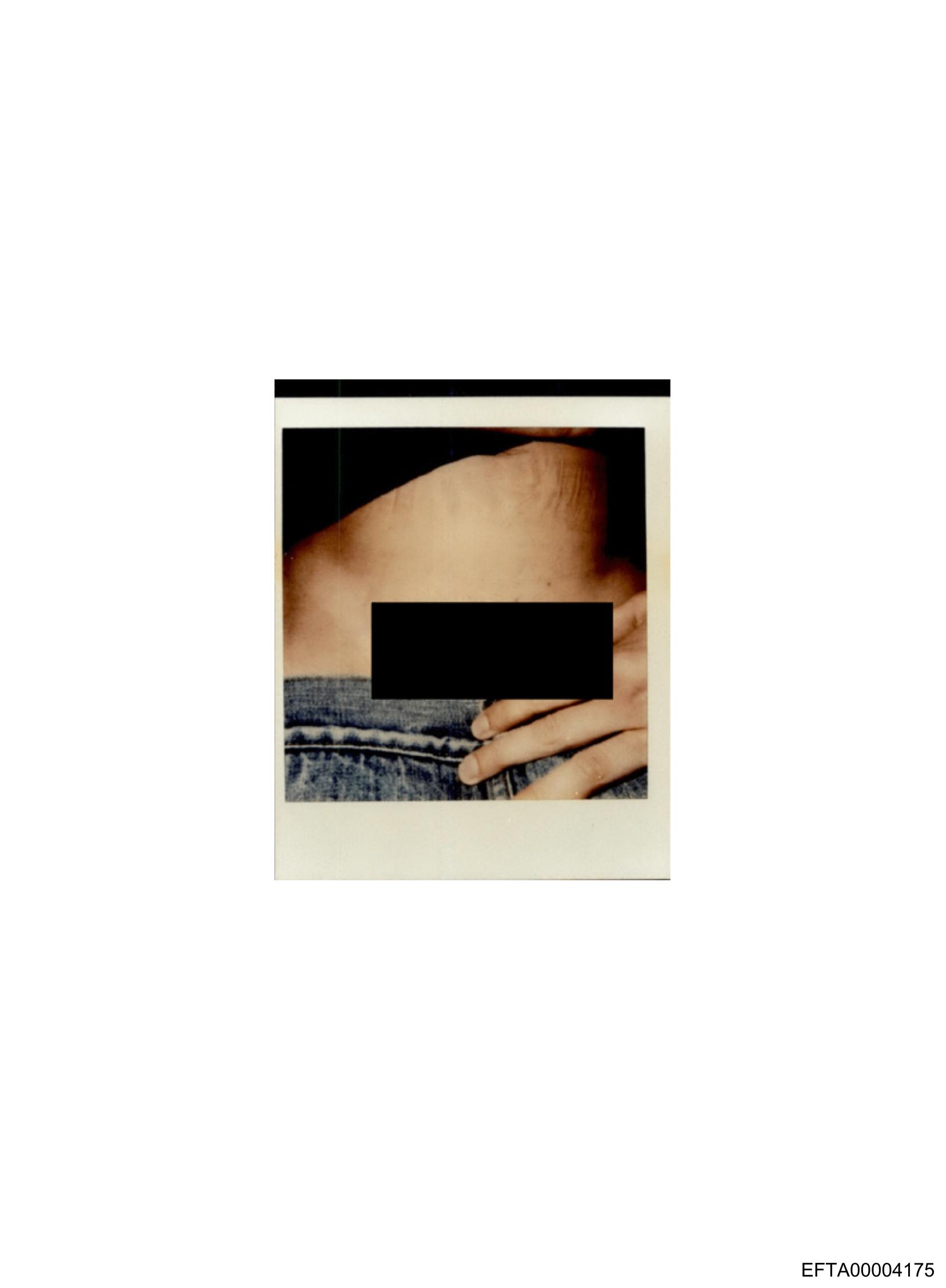 The image appears to be a photograph with a central figure that is partially obscured by what seems to be an overlay of a different photograph or graphic element. The central figure, which could be interpreted as a person's torso, is wearing jeans and has only their lower abdomen visible due to the overlay. There is a noticeable rectangular shape covering part of this torso, with diagonal lines suggesting it might represent a censored area in a typical image analysis context. The background is a plain, neutral color without any distinctive features or text that can be identified within this description's constraints.