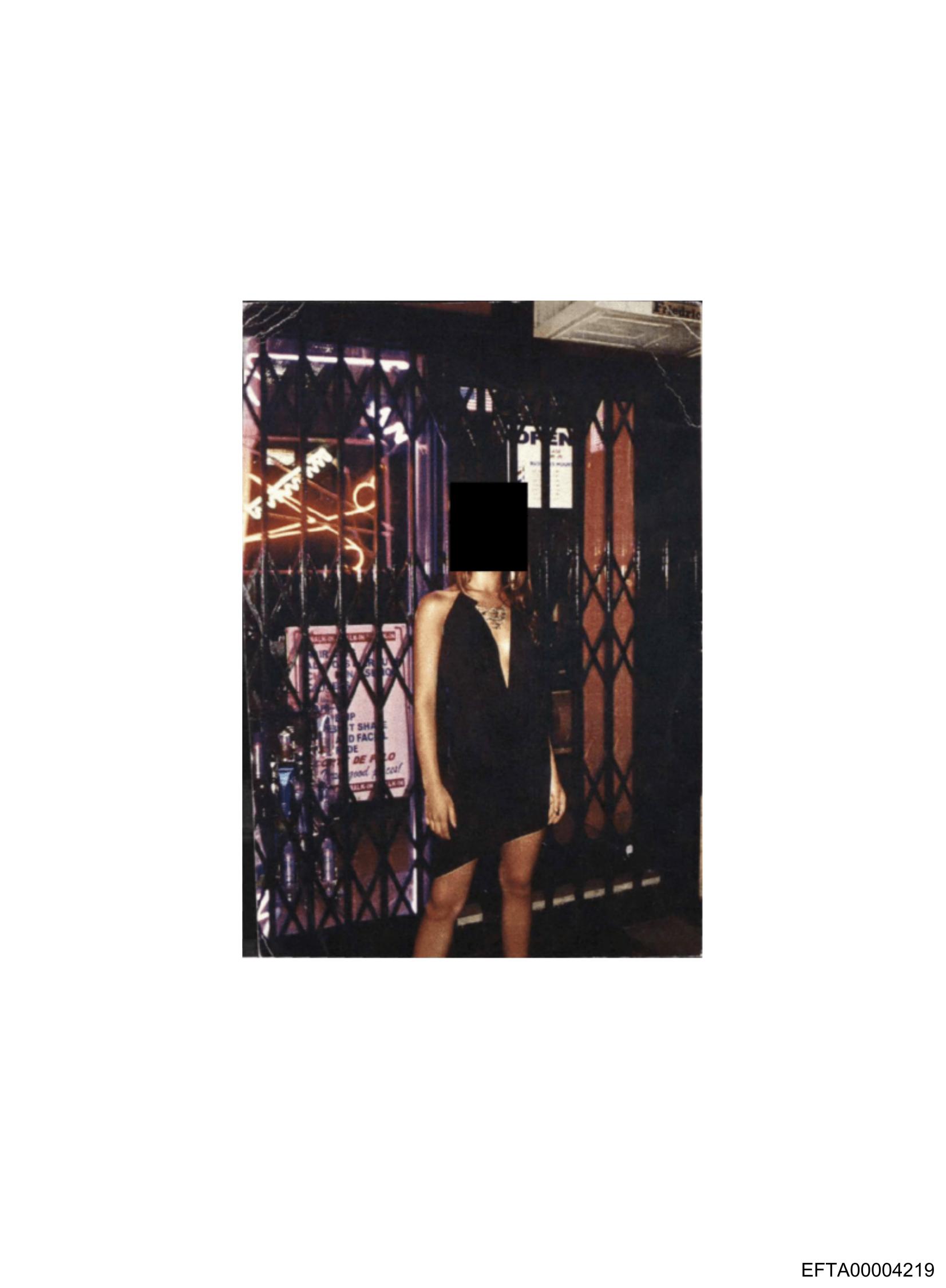 The image appears to be a photograph that has been altered by covering the face of one individual with a black mark. The photo features two individuals; one whose face is obscured and another who seems to be standing next to them. The person in focus is wearing what looks like a sleeveless top or dress, while the background suggests an indoor setting possibly at night due to artificial lighting visible through what appears to be bars or gates. There's no text on the image that can be discerned from this description.