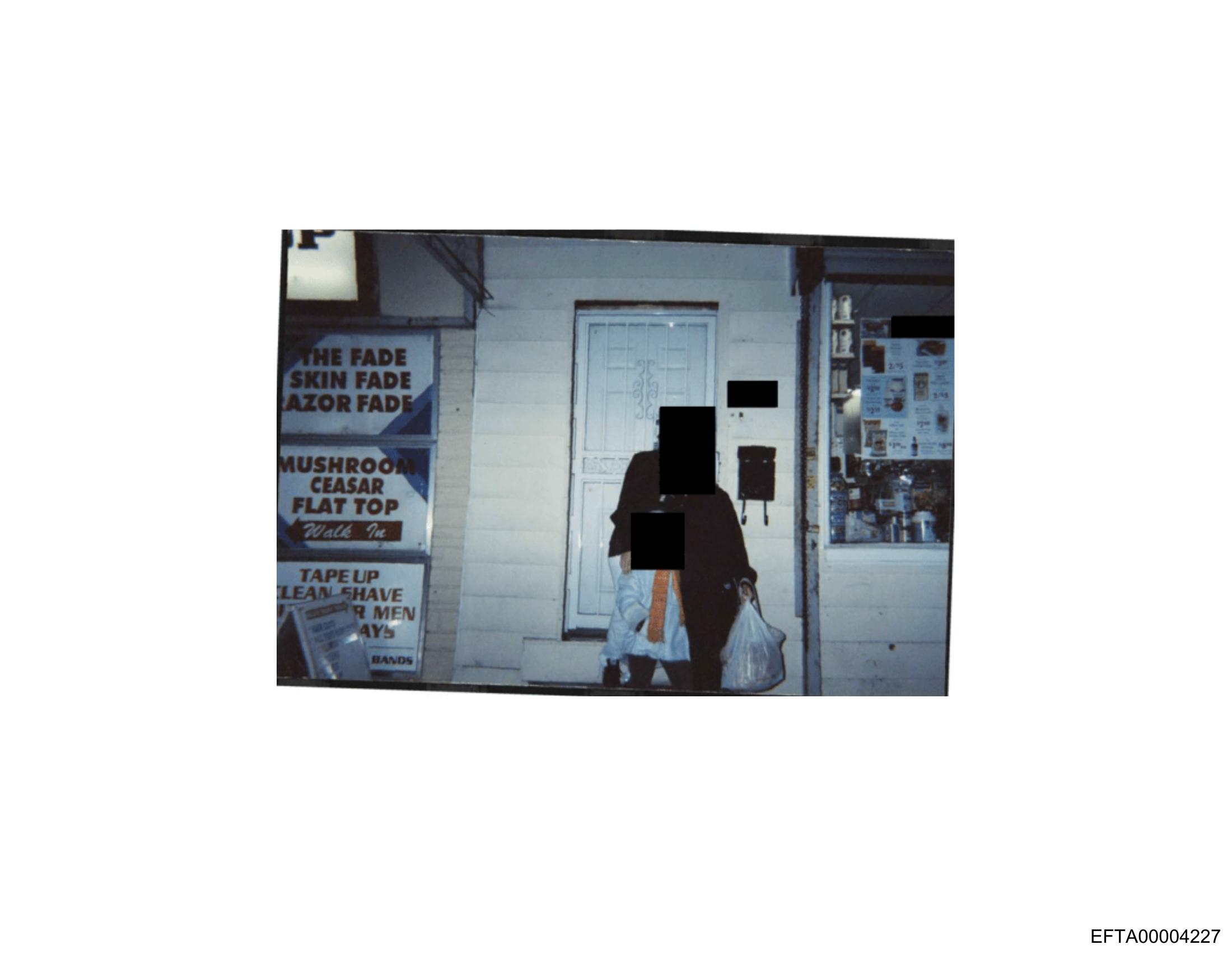 The image appears to be a screenshot of a video paused on the scene where someone is standing at a door that reads "Mushroom Flat Top". The person's face has been pixelated out for privacy. On the left side, there is another entrance with a sign that says "The Fades" and a menu board below it. In the background, there's a shop or storefront with various items displayed. The overall quality of the image suggests it might be from an older video source.